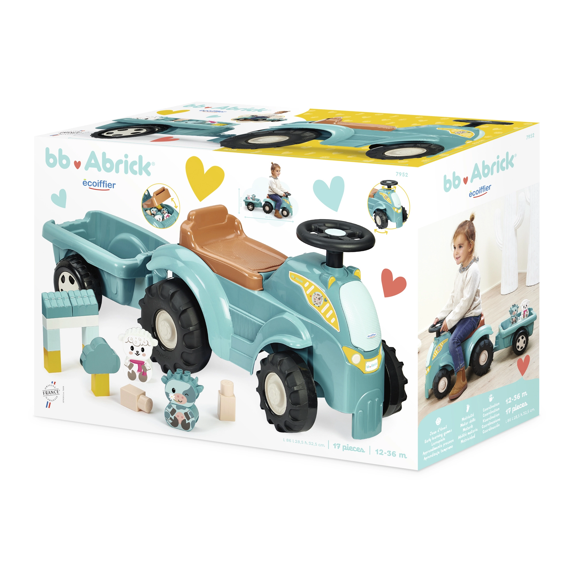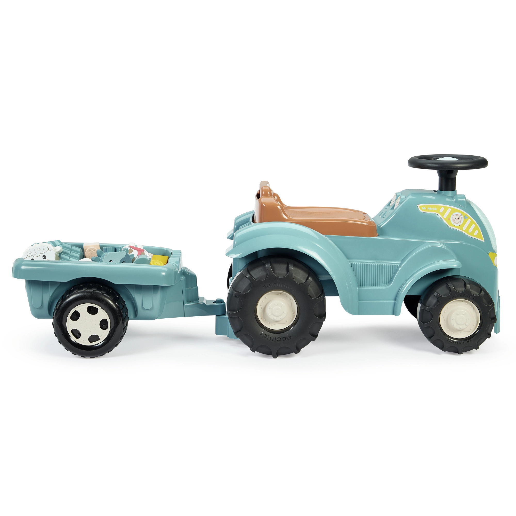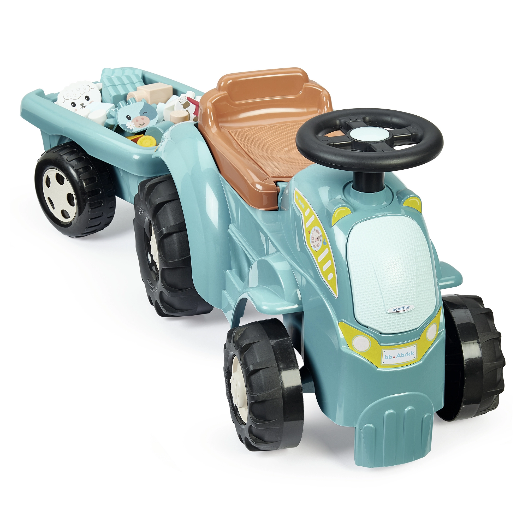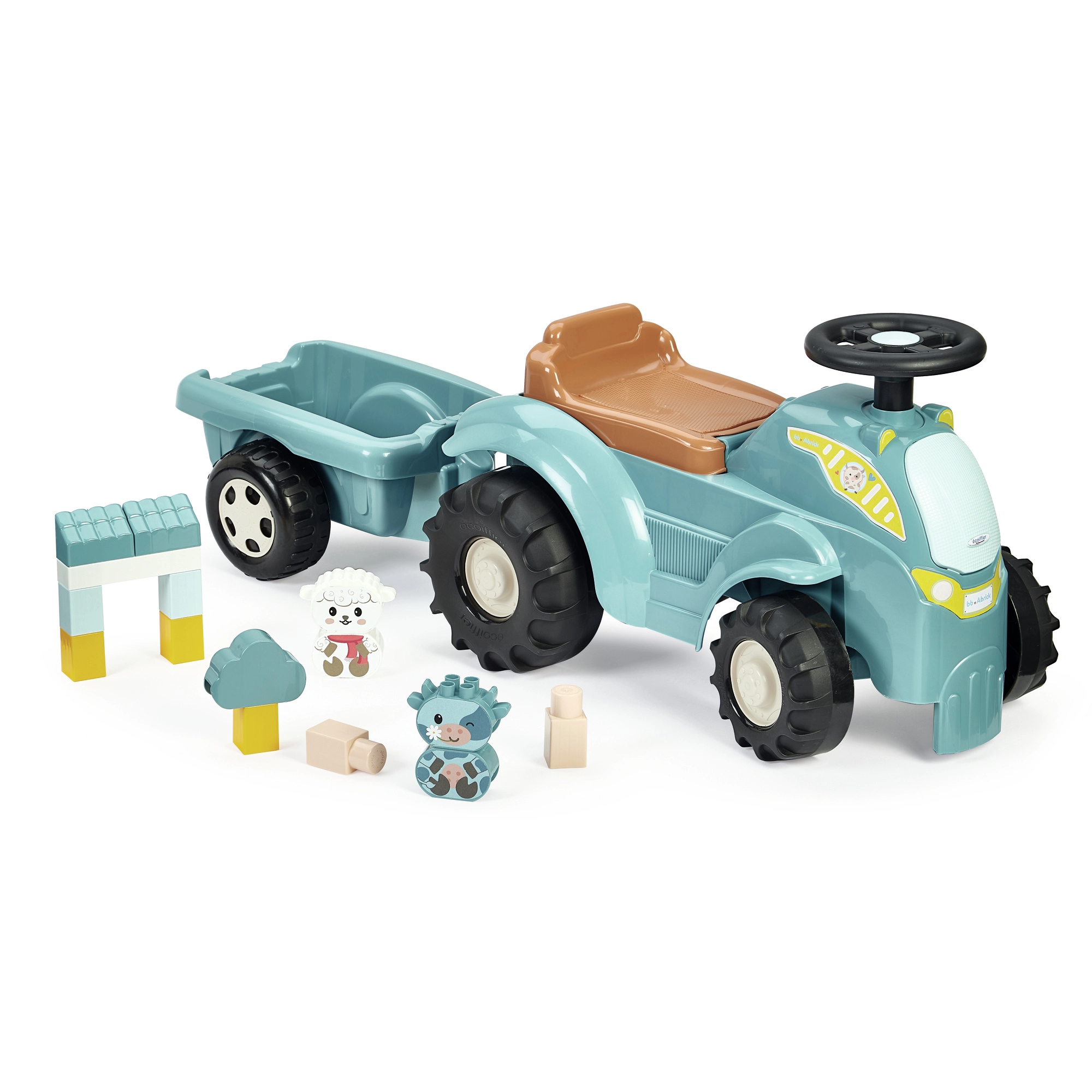 Atraskite smagų važinėjamą traktorių patiems mažiausiems su nuimama priekaba ir ABRICK kaladėlių rinkiniu. 12–36 mėn. vaikams patiks važiavimas su veikiančiu vairavimu, tvirta plastikinė konstrukcija ir daiktadėžė po sėdyne. Rinkinyje yra 15 kaladėlių, įskaitant dalis gyvūnėliams – karvei ir aviai – sudėti. Visas rinkinys lavina motoriką, vaizduotę ir pusiausvyrą.