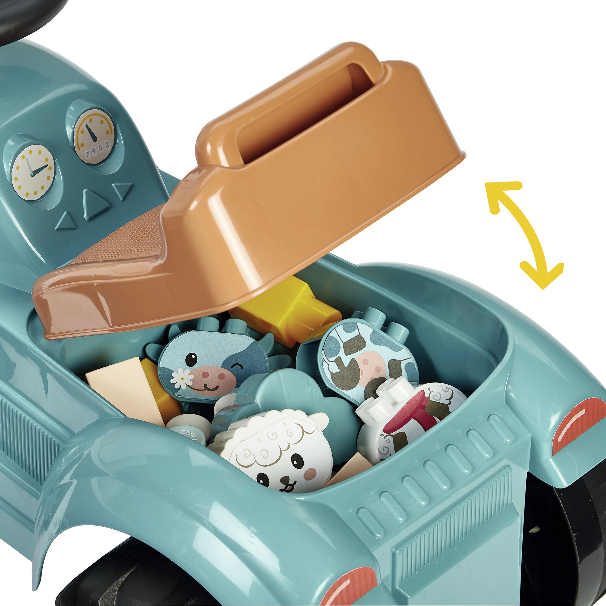 Šis tvirtas vaikiškas traktorius su priekaba iš ÉCOIFFIER ABRICK serijos sukurtas pirmiesiems „lenktynių“ turams namuose ir sode. Dėl didelių ratų ir patogios sėdynės važiavimas stabilus ir saugus, o nuimama priekaba sutalpins kaladėles ir mėgstamus žaislus. Praktiška slėptuvė po sėdyne leidžia smulkmenas visada turėti po ranka.