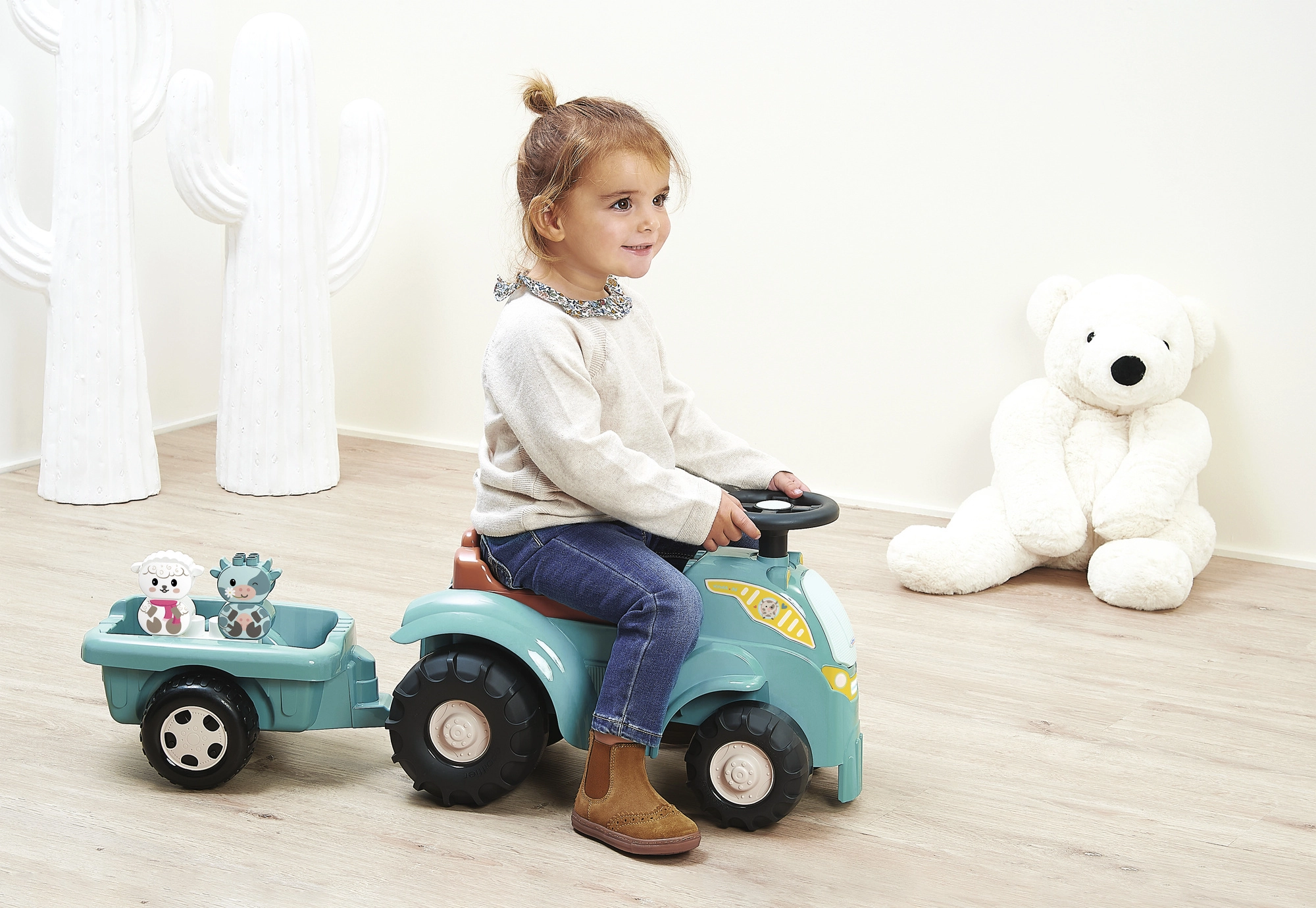 Praktišką priekabą lengva prikabinti ir atkabinti. Vaikai gali vežioti kaladėles, gyvūnėlius ir mėgstamas smulkmenas, lavindami fantaziją žaidžiant ferma.