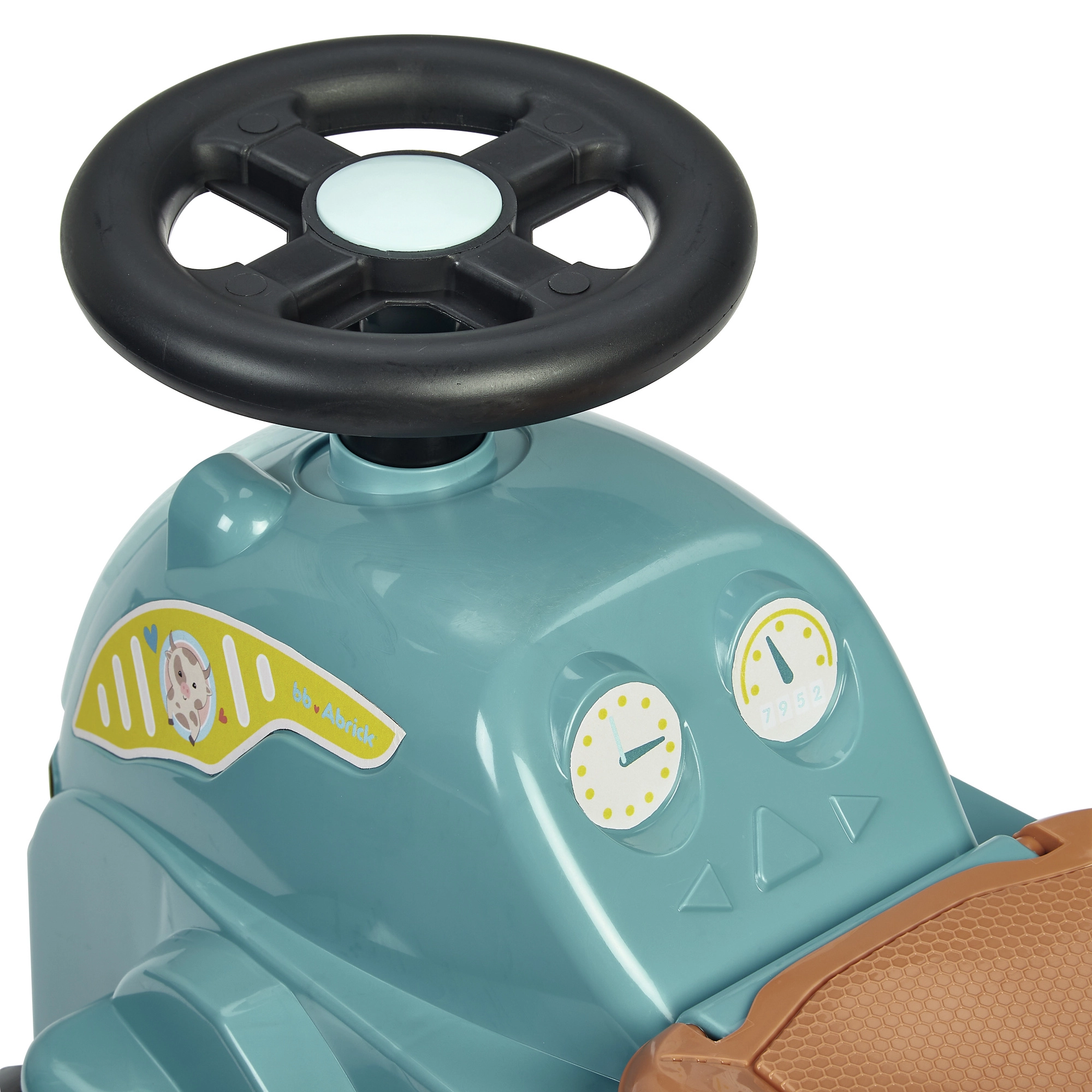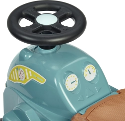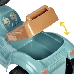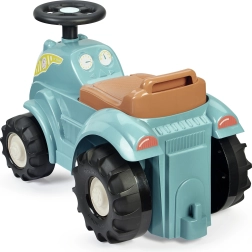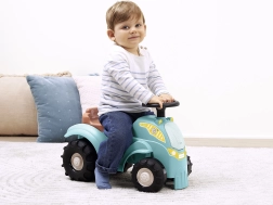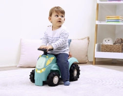 Šis pasispiriamasis traktorius turkio/mėlynos spalvos su ruda sėdyne ir masyviais juodais ratais sukurtas patiems mažiausiems vairuotojams. Tvirto plastiko korpusas ir plati ratų vėžė užtikrina stabilų, saugų važiavimą, o kompaktiški matmenys leidžia patogiai naudoti patalpose – tiek ant kilimo, tiek ant lygių grindų.