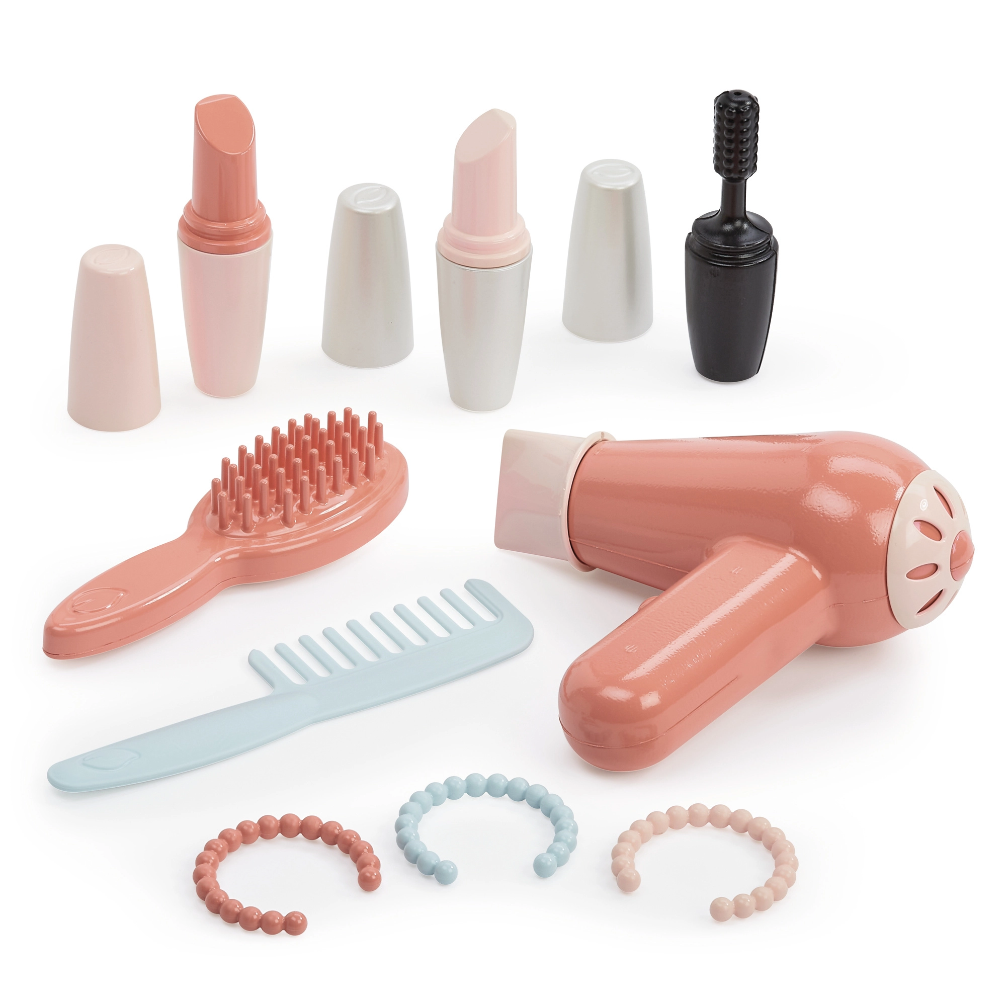 Rinkinyje yra šukos, šepečiai, vaikiškas fenas, „lūpdažiai“, „blakstienų tušas“, paletė ir apyrankės – puikiai tinka kūrybingam grožio salono žaidimui.