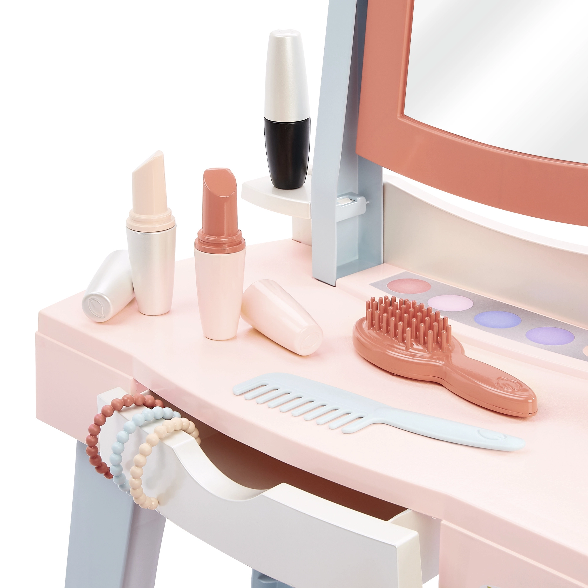 Integruotas veidrodis makiažo ir šukuosenų žaidimams, o ištraukiamas stalčiukas – patogiam ir tvarkingam visų priedų laikymui.