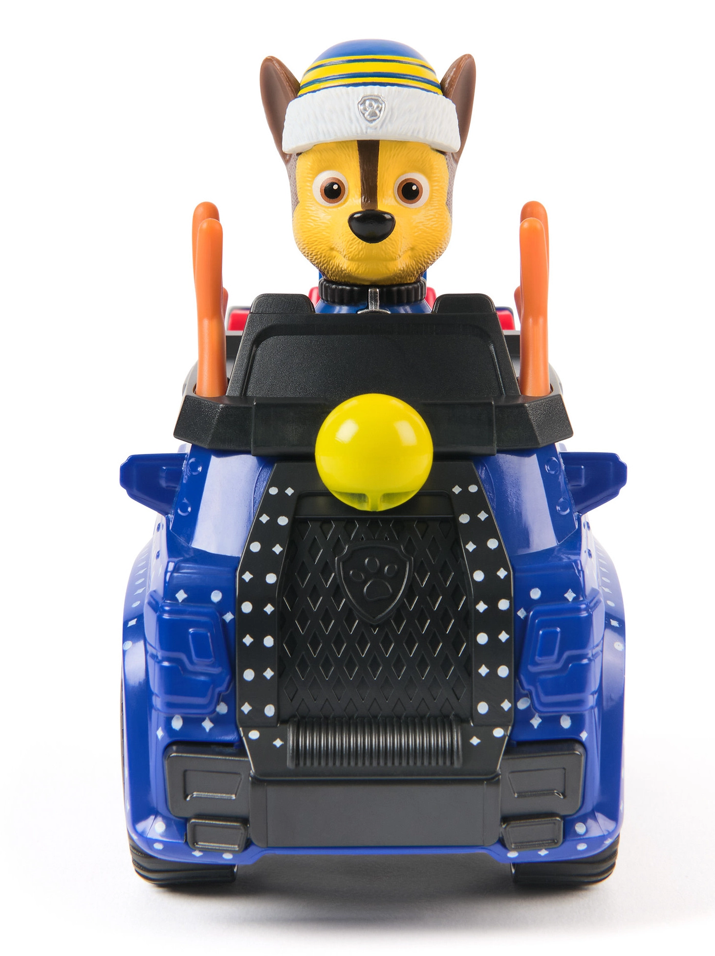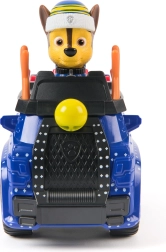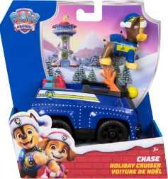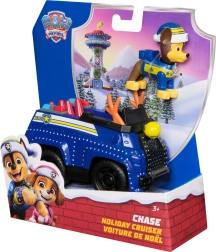 Detalus mėlynas automobilis su kalėdiniais akcentais ir judančiais ratais. CHASE figūrėlė su žiemine kepure sėdi tiesiai kabinoje ir pasirengusi veiksmui.