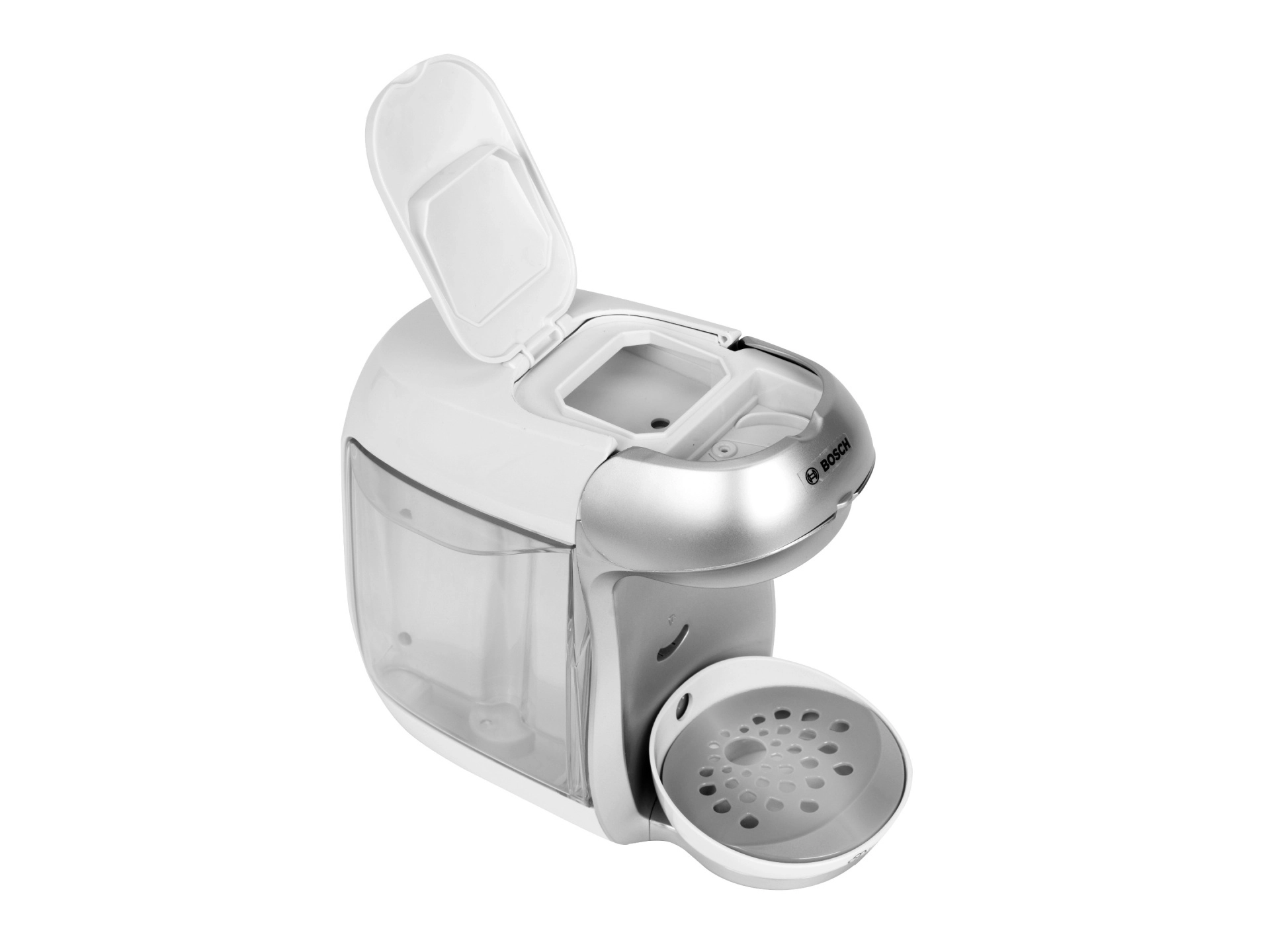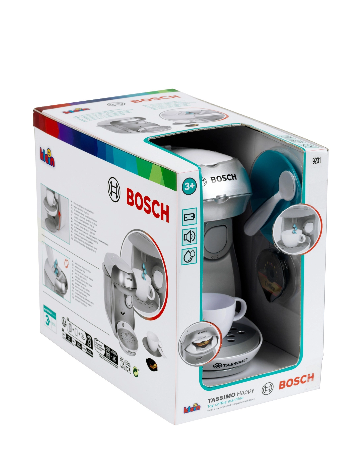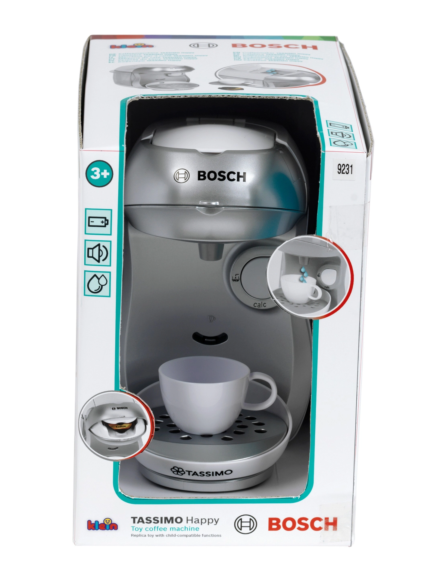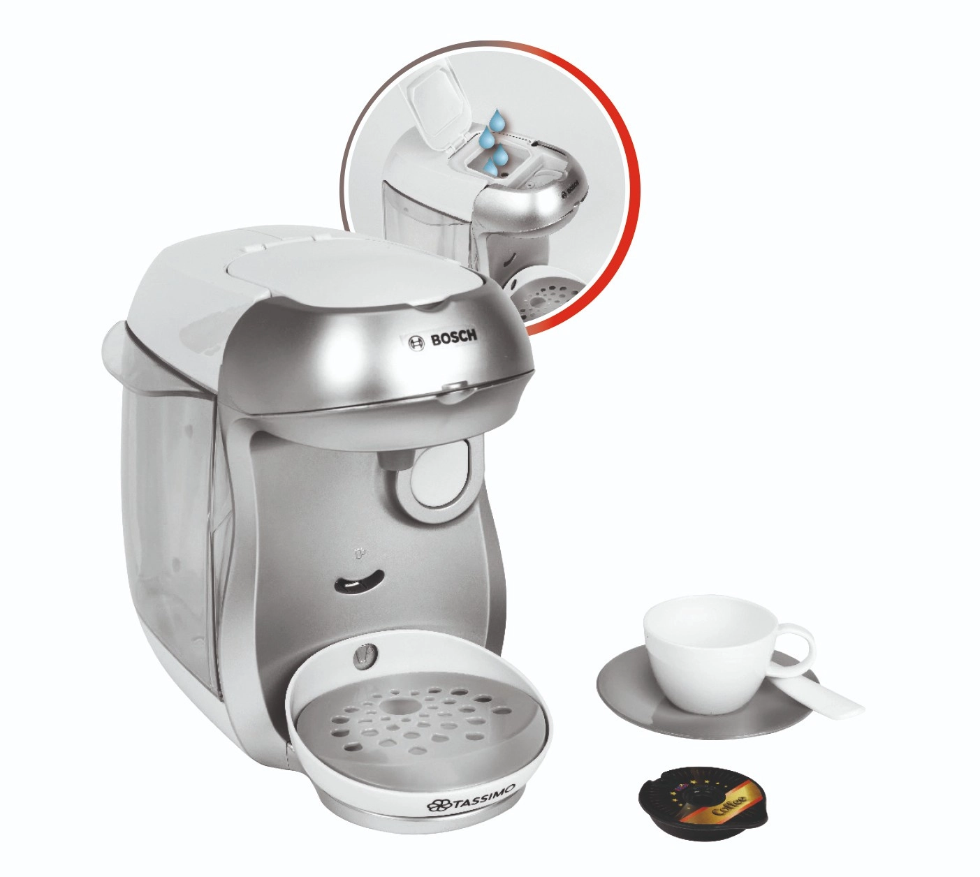 Vaikiškas kavos aparatas TASSIMO BOSCH baltos ir sidabrinės spalvos ištikimai atkuria tikrą įrenginį, tačiau yra visiškai saugus vaikams. Tereikia įpilti vandens į bakelį, įdėti kapsulę po viršutiniu dangteliu ir paspausti didelį start/stop mygtuką – aparatas paleis vandens tekėjimą ir pridės autentiškų garsų, kad žaidimo patirtis būtų dar realesnė.