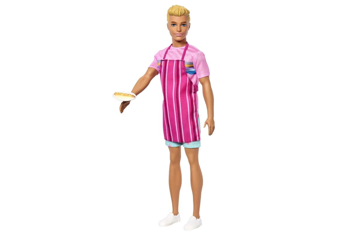 - Ken lėlė, rožiniai marškinėliai, gėlėti šortai, balti batai, dryžuota prijuostė, precelis, dešrainis, 2× ledas