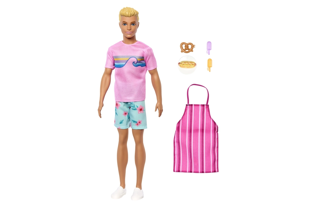 Pažadinkite vaizduotę su lėle Barbie Ken ir paplūdimio aksesuarų rinkiniu. Kenas vilki rožinius marškinėlius su spauda, gėlėtus šortus ir baltus sportbačius. Rinkinyje yra smagių rekvizitų vaidmenų žaidimams – dryžuota prijuostė, precelis, dešrainis ir du ledai ant pagaliuko. Puikus žaislas vaikams nuo 3 metų, skatinantis kūrybiškumą ir vaidmenų žaidimus.