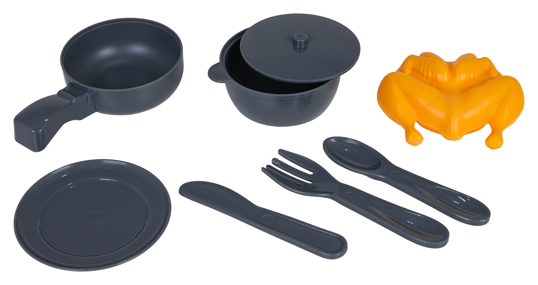 Į komplektą įeina keptuvė, puodas su dangčiu, lėkštutė, stalo įrankiai ir vištos muliažas – viskas mažojo virėjo vaidmeniui.