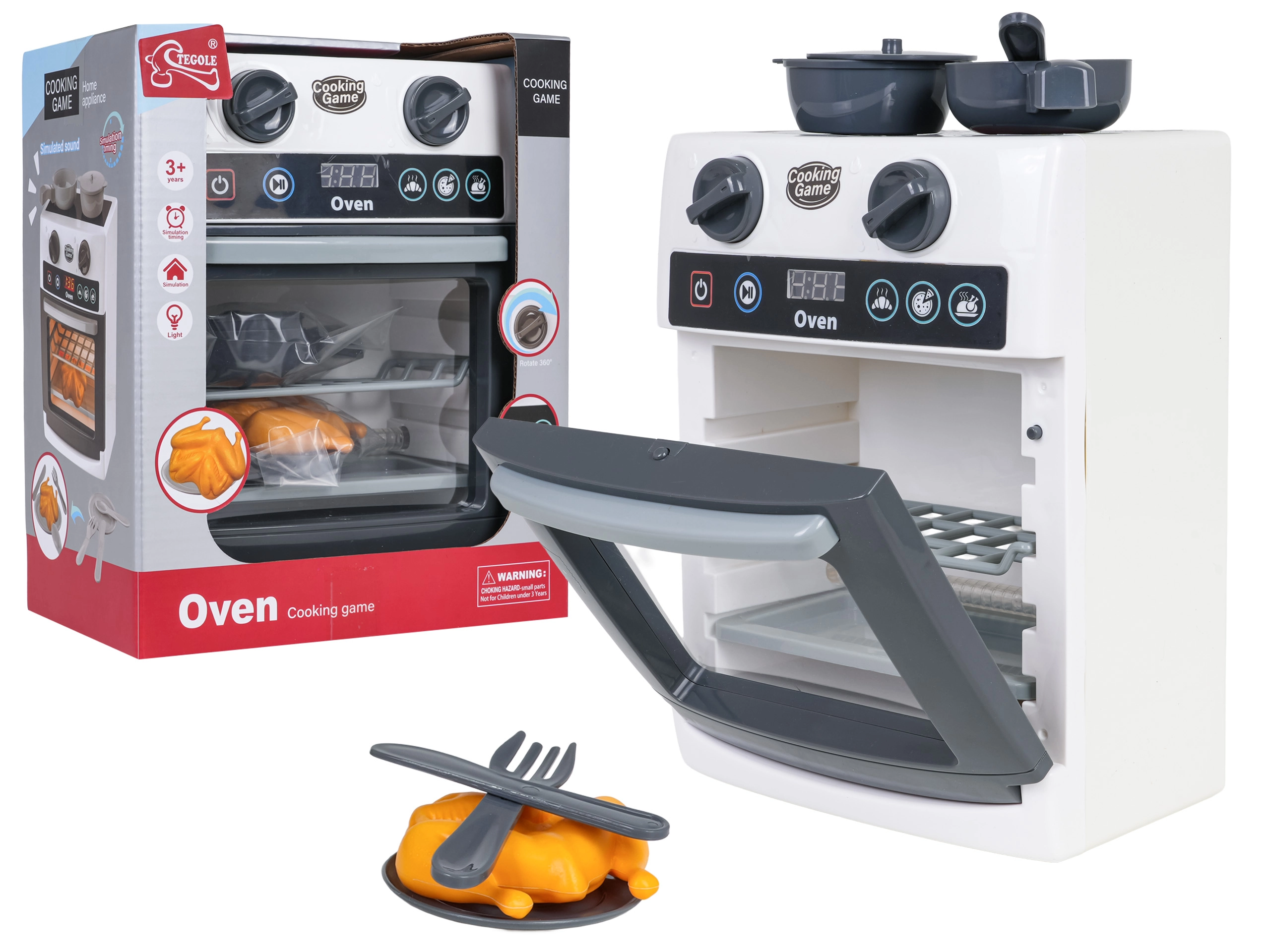 Pakuotėje rasite viską, ko reikia: vištos muliažą, keptuvę, puodą su dangčiu, lėkštutę ir stalo įrankius. Dėl kompaktiškų matmenų orkaitė lengvai telpa ant vaikiško stalo ar žaidimų kampelyje ir tampa vaidmeninių žaidimų centru. Maitinimas: 3× AA 1,5 V (nepridedama).