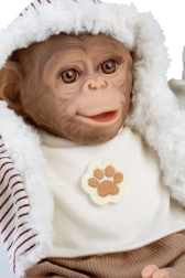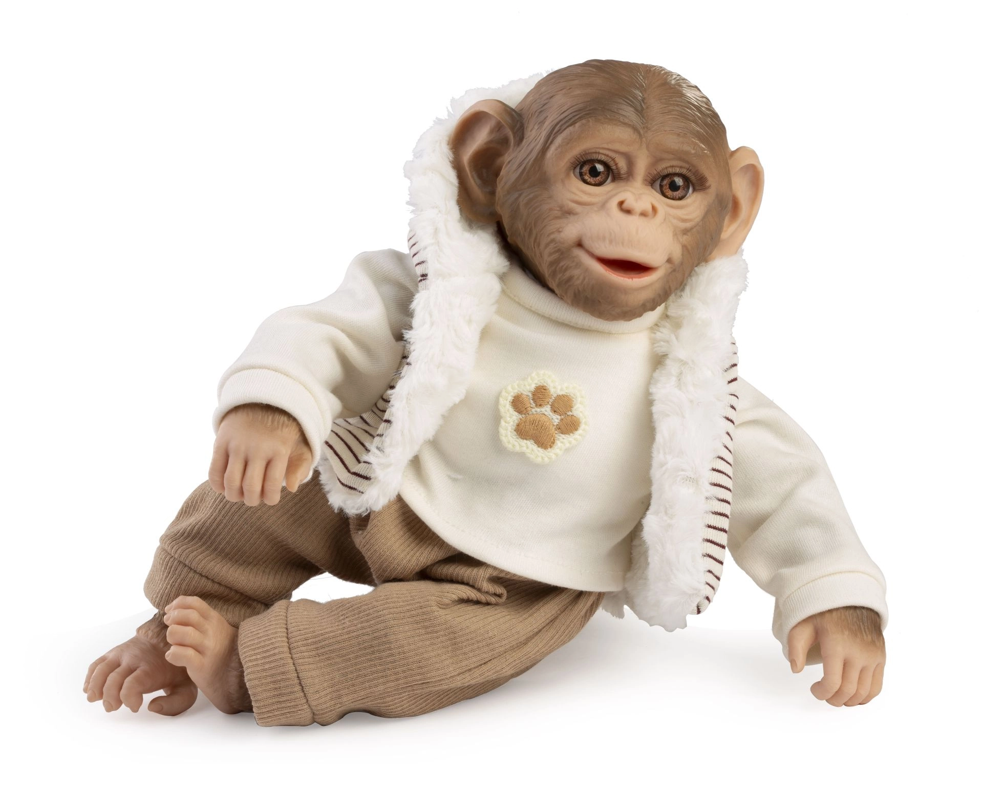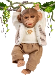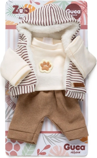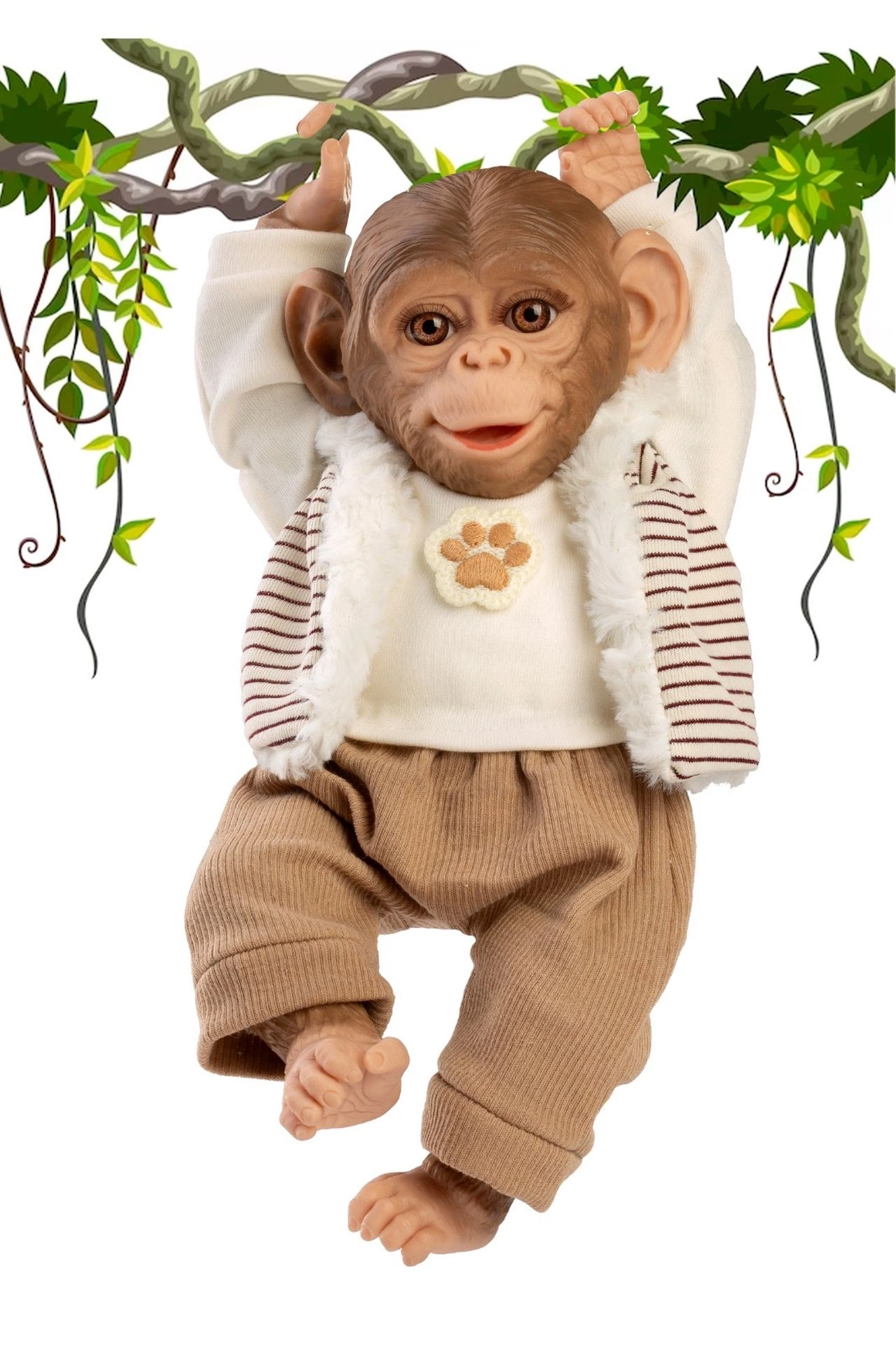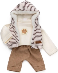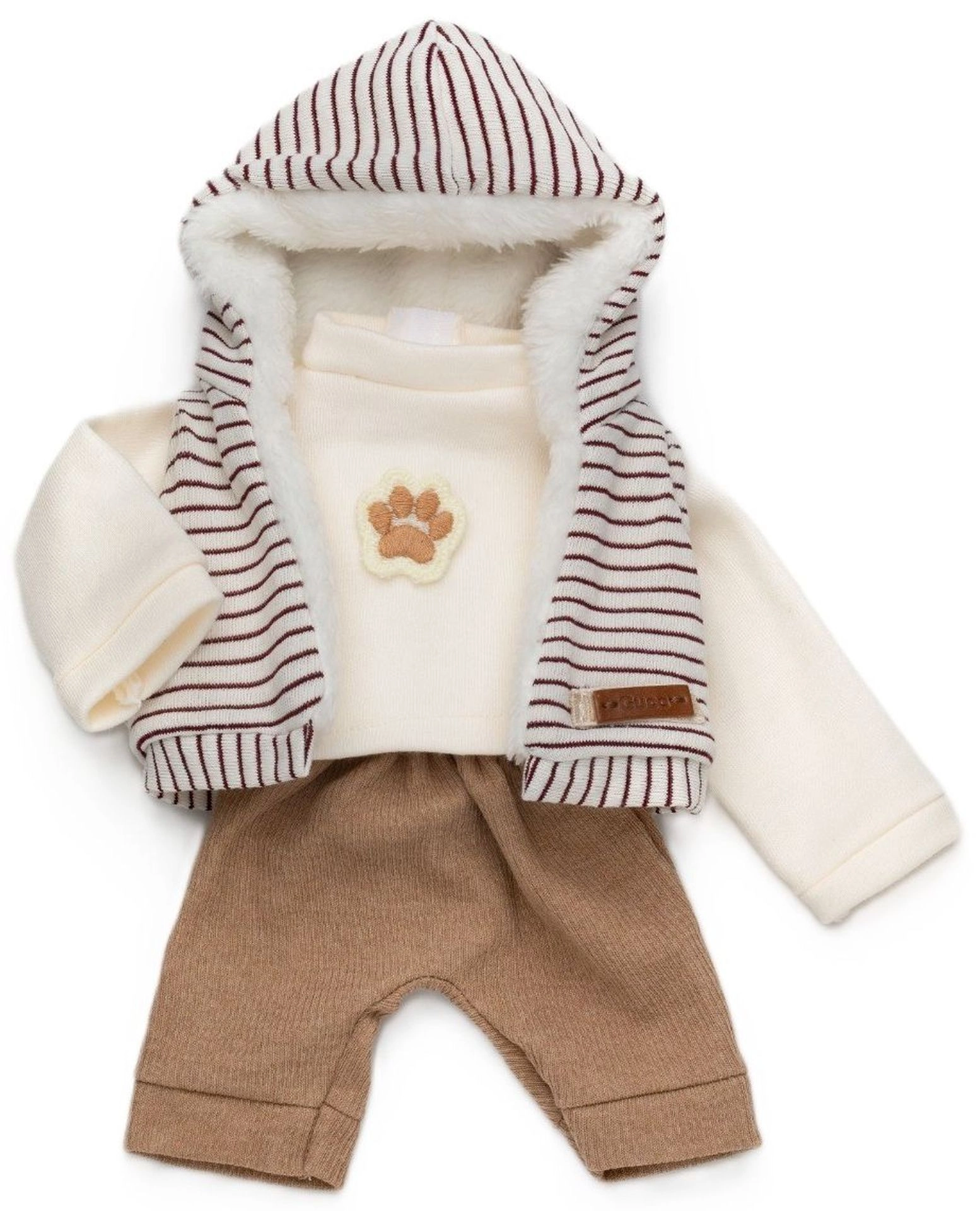 Šis stilingas 32 cm Reborn beždžionėlės komplektas apima tris suderintus elementus – kreminius ilgomis rankovėmis marškinėlius su letenėlės motyvu, dryžuotą liemenę su gobtuvu ir šiltu kailiuku bei patogias kelnes. Apranga sukurta taip, kad būtų lengva aprengti ir nurengti, kad vaikai galėtų greitai keisti mėgstamo žaislo išvaizdą.