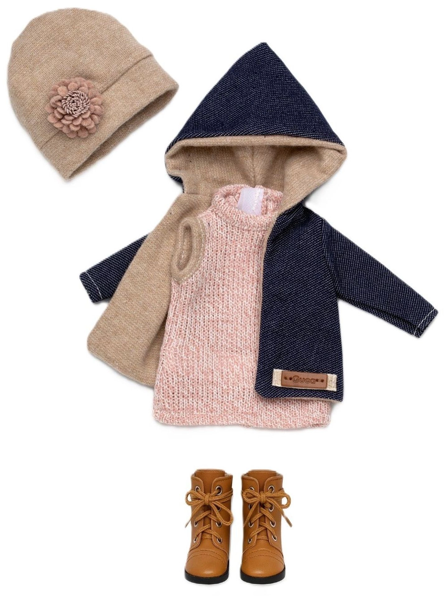 Paltukas su gobtuvu ir megztos detalės išlaikys lėlę šiltą, o bateliai suteiks visumai realistiškumo.