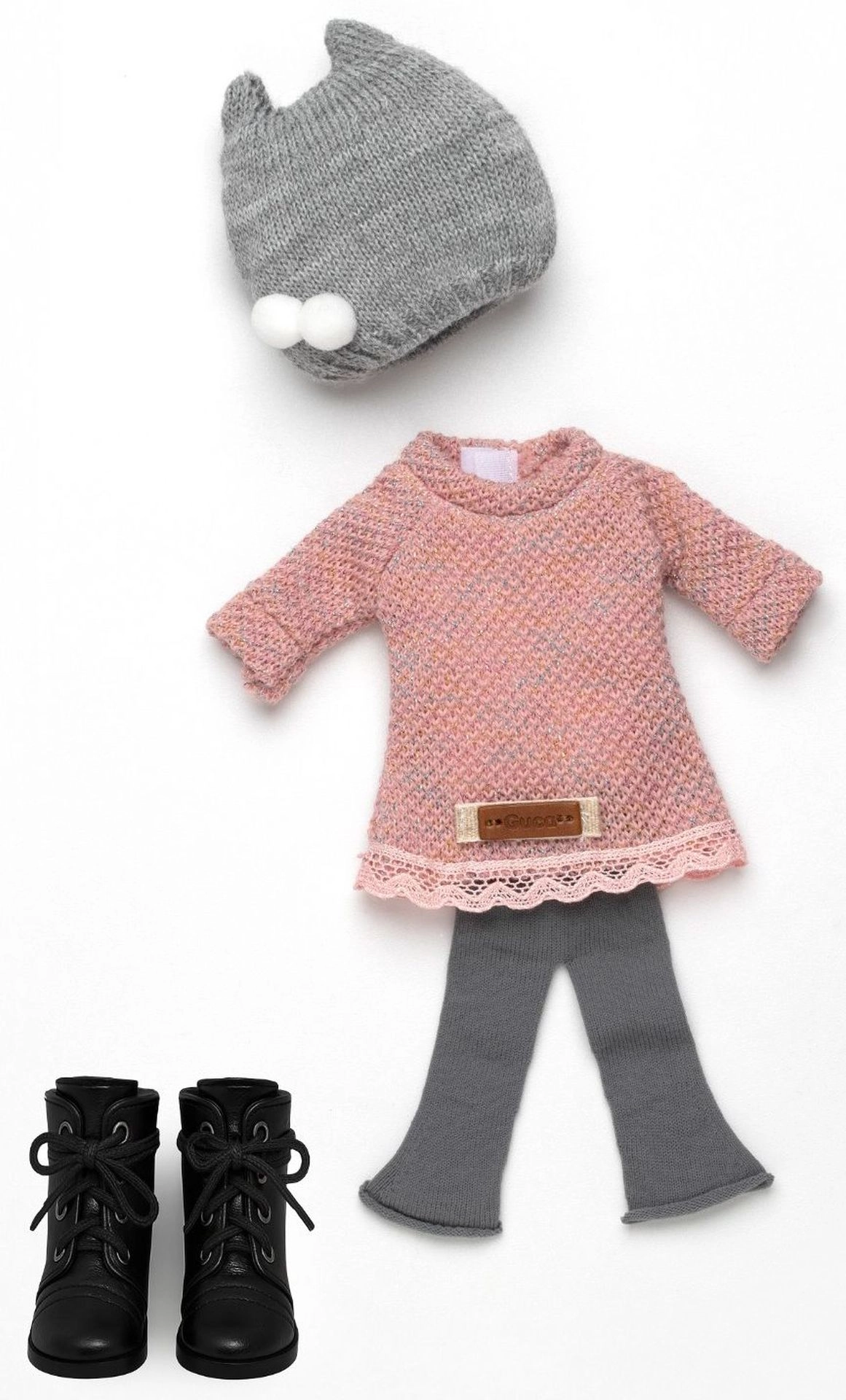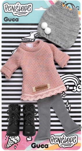 Padovanokite savo 34 cm dydžio lėlei Penelope naują garderobą. Šis rankų darbo rinkinys derina švelnią megztą išvaizdą ir patogumą: rožinė tunika su puošyba, pilkos platėjančios tamprės, pilka kepurė su dviem bumbulais ir juodi raištiniai bateliai. Apranga puikiai priglunda ir dėl apgalvotų detalių skatina kūrybišką žaidimą ir stilingą derinimą.