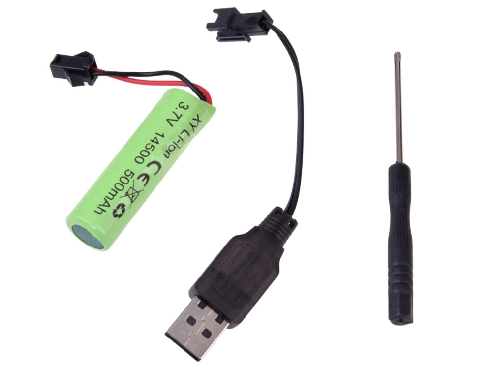 Komplekte yra Li-ion baterija 14500 3,7 V ir USB kabelis patogiam įkrovimui. Pirmasis įkrovimas trunka maždaug 1 valandą.