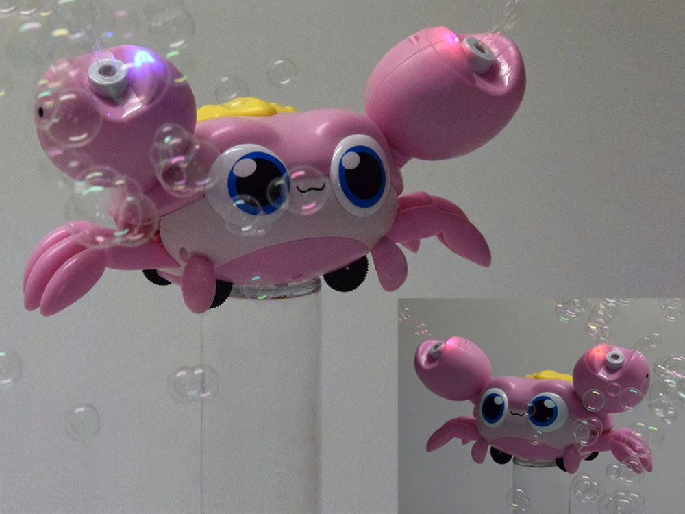 Krabas juda mažais ratukais ir iš žnyplių leidžia švelnių burbuliukų srautą – puikiai tinka sodui, balkonui ir vaikų šventėms.