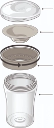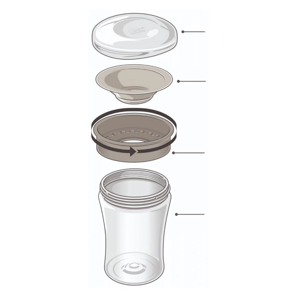 Puodelį sudaro tik trys dalys, todėl jį labai paprasta išardyti ir valyti, be to, jis tinka indaplovei. PP ir silikono medžiagos yra be BPA ir atitinka EN 14350 standartą. Suderinamumas su NUK Easy Learning serija leidžia paprastai keisti dalis pagal poreikį.