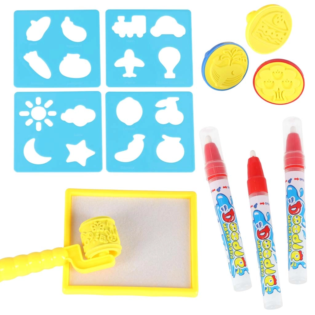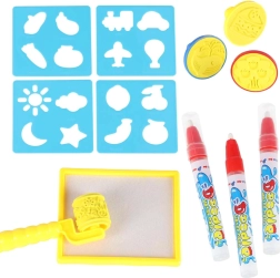 Vandens flomasteriai, antspaudukai, volelis, trafaretai ir dubenėlis vandeniui plečia kūrybos galimybes ir įkvepia naujai veiklai bei raštams.