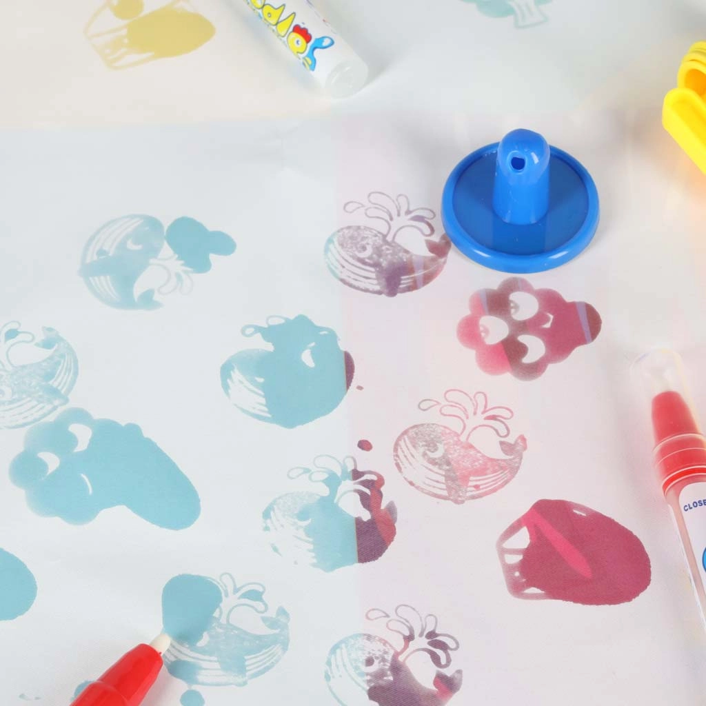 Pakuotėje rasite viską, ko reikia iškart kurti: vandens flomasterius, antspaudukus, dubenėlį vandeniui, volelį su raštais ir trafaretus. Minkšta, sulankstoma konstrukcija idealiai tinka vaikų kambariui, į svečius ar kelionėms.
