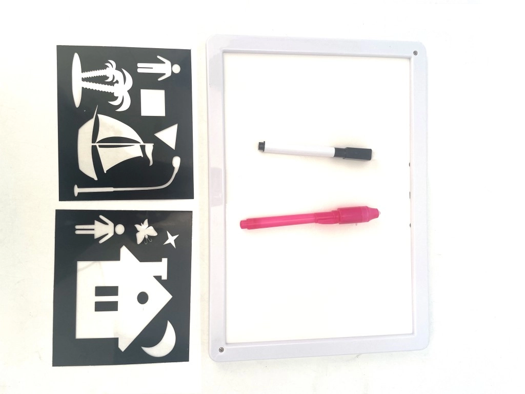 Šviečianti tamsoje piešimo lenta A4 – puiki dovana mažiesiems menininkams. Naudodami specialų šviečiantį pieštuką vaikai kuria šviesos piešinius, kurie užgesus šviesai švyti tamsoje ir pamažu išnyksta, todėl galima vėl ir vėl kurti. Kita pusė skirta kaip valoma balta lenta klasikiniam piešimui.