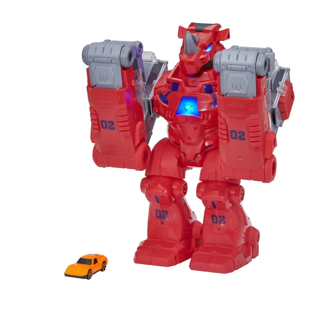 Teamsterz Robo Wreckerz Rhino Slam suteikia vaikams dinamišką žaidimo patirtį. Tvirtos rankos atsiveria, įdedate automobiliuką, o paspaudus raganosio galvą, transporto priemonė iššauna skaidriomis trasomis abejomis rankomis žemyn. Mėlynai šviečiančios LED akys ir šviesos efektai krūtinės srityje kartu su griausmingais garsais sustiprina veiksmo atmosferą.