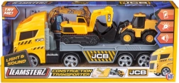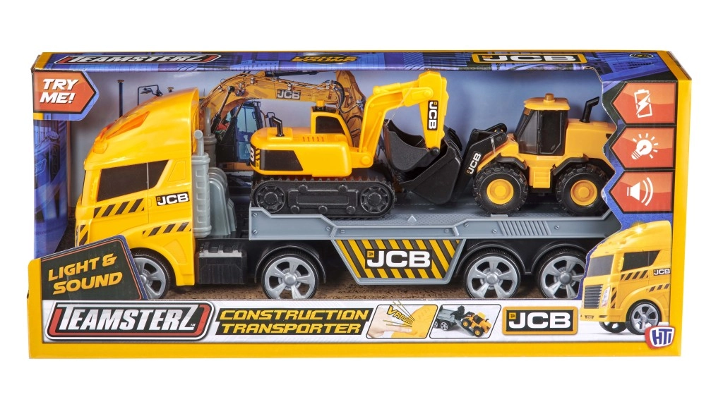 JCB transporto rinkinys suteikia vaikams realistišką statybų patirtį: geltonas transporteris su mirksinčiomis šviesomis ir variklio garsais, laisvai besisukantys ratai ir du statybiniai įrenginiai – ekskavatorius ir ratinis krautuvas su rankiniu būdu valdomais kaušais kūrybiškam žaidimui ir smulkiosios motorikos lavinimui.