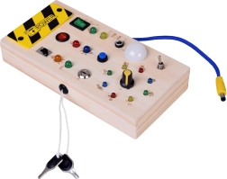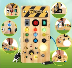Ši medinė montesorio aktyvi lenta sujungia praktinį mokymąsi ir pojūčių žaidimą. Vaikai jungia laidą, spaudinėja mygtukus, perjungia jungiklius ir stebi, kaip spalvoti LED reaguoja – taip natūraliai įsisavina priežasties–pasekmės ryšį ir lavina smulkiąją motoriką bei akies–rankos koordinaciją.