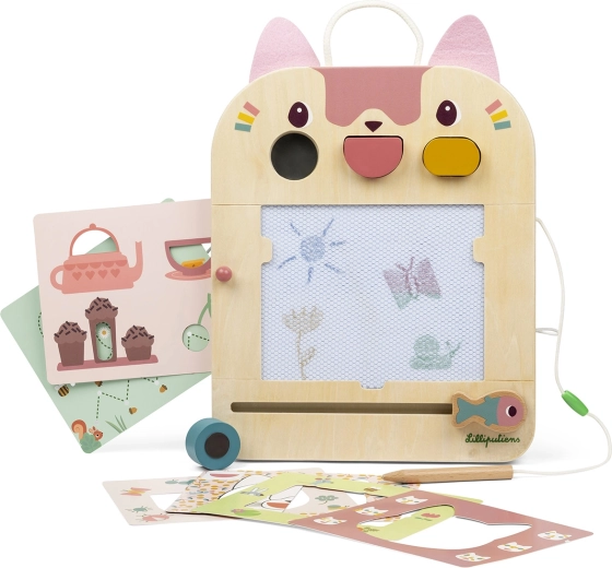 Atraskite maginę piešimo lentelę katytė Žana iš Lilliputiens, kuri vaikams nuo 18 mėn. siūlo begalines piešimo ir žaidimų galimybes. Rinkinyje yra 3 antspaudukai su formomis, 6 dvipusiai veiklų kortelės ir medinis pieštukas su virvele. Piešinius galima lengvai greitai ištrinti ir pradėti iš naujo – idealu lavinti smulkiąją motoriką ir jutiminius pojūčius.