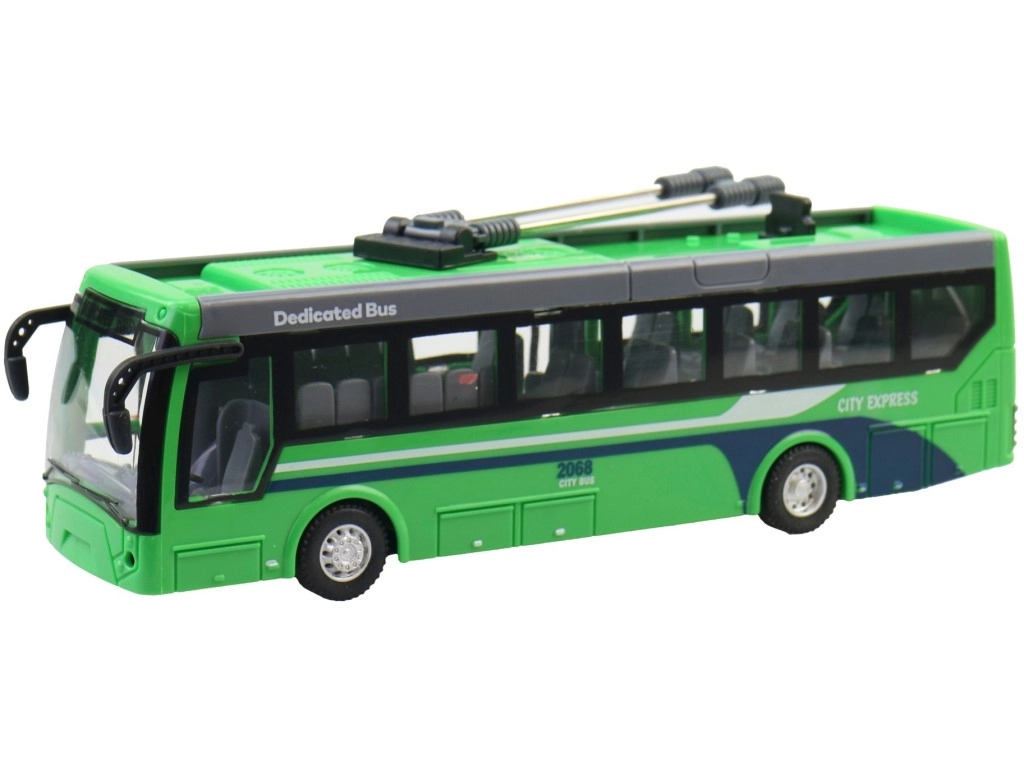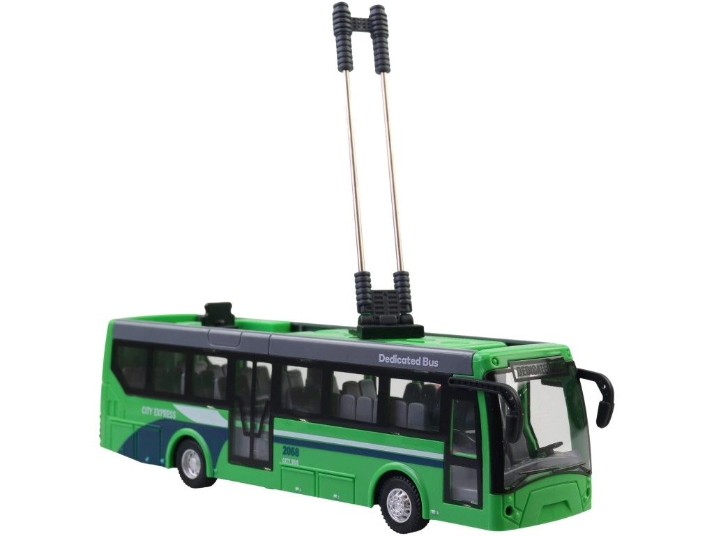 Žalias plastikinis nuotoliniu būdu valdomas troleibusas pradžiugins mažus transporto mėgėjus nuo 3 metų. Siūlo realistines detales, besisukančius ratus, ištraukiamas troles ir kompaktiškus matmenis žaidimams namuose ir kelionėse. Puiki dovana berniukams su langelio tipo pakuote (window box).