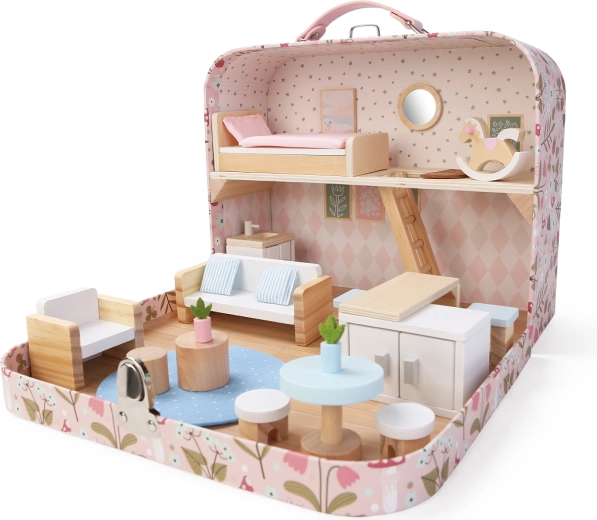 Atraskite žavingą kelionių pasaulį: nešiojamasis lėlių namelis, paslėptas elegantiškame lagaminėlyje. Atidarę jį, paversite į jaukius namus su miniatiūriniais baldais ir dekoracijomis. Idealu žaisti namuose ir kelionėse, lavina vaikų kūrybiškumą ir vaizduotę. Rinkinyje yra supamasis arkliukas, lovytė, sofa, fotelis, kopėtėlės į antrą aukštą ir kiti priedai. Nešiojamas lagaminėlis, gausi komplektacija, lengvas nešiojimas ir pramoga vaikams nuo 3 metų.