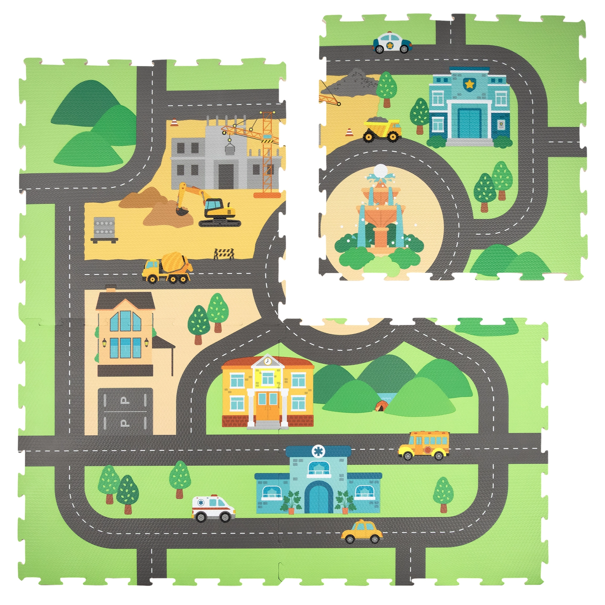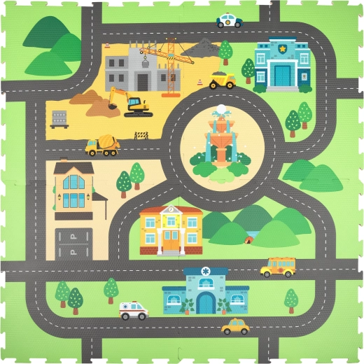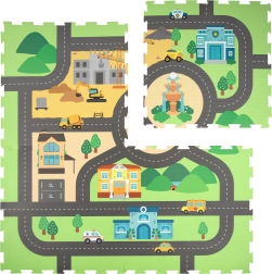 Atraskite linksmą ir saugų HUMBI putų kilimėlį su miesto gatvių motyvu. Rinkinį sudaro 4 didelės dalys, kurios sudėtos sudaro apie 120 × 120 cm plotą ir suteikia minkštą, izoliuojantį ir neslystantį paviršių žaidimams. Vaikai gali susidėlioti savo miestelį ir kelius, lavinti kūrybiškumą ir smulkiąją motoriką. Pagaminta iš patvarių EVA putų be ftalatų, formamido, BPA ir PVC.
