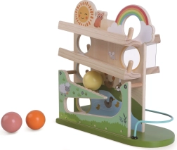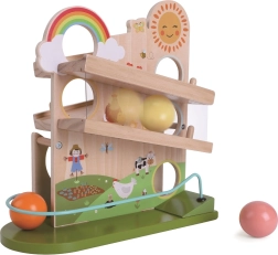 Ši kūrybiška rutuliukų trasa su gaivia kaimiška stilistika paverčia kiekvieną žaidimą spalvingu nuotykiu. Vaikai stebi, kaip rutuliukai rieda įvairaus nuolydžio takeliais, pradingsta angose ir vėl pasirodo – viską lydi linksmos saulės, vaivorykštės ir gyvūnėlių iliustracijos. Stabilus pagrindas ir kruopščiai nušlifuotos medinės detalės užtikrina saugų naudojimą net patiems mažiausiems.