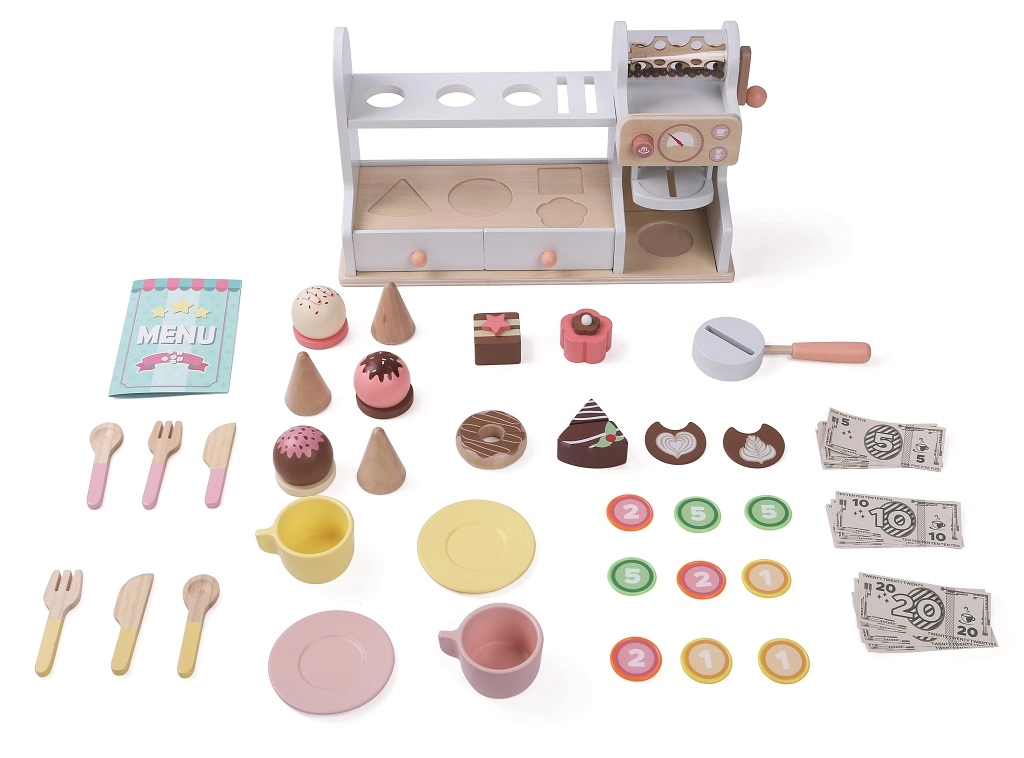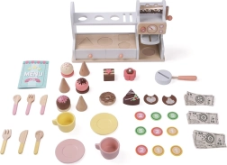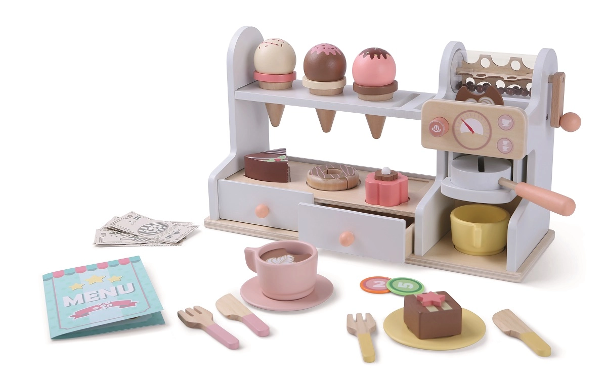 Ši stilinga medinė cukrainė ir kavinė 2 viename pavers vaikų kambarį mažu bistru. Kompaktiškas pultas su kavos aparatu, desertų vitrina ir lentyna su angomis ledų rutuliukams kviečia į begalę pramogų. Komplekte yra ir mokėjimų stalčius su netikrais pinigais, tad vaikai gali treniruotis aptarnauti ir atsiskaityti.