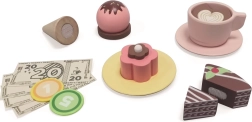 Rinkinys pagamintas iš patvarios medienos švelnių pastelinių spalvų ir siūlo gausią komplektaciją: puodelius su lėkštutėmis, šaukštelius, stalo įrankius, pyragaičius, ledus ir kitus priedus, kurie skatina vaidmenų žaidimus, smulkiosios motorikos, socialinių įgūdžių ir kalbinės raiškos ugdymą.