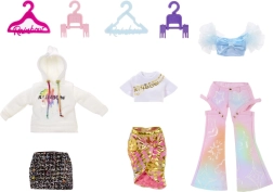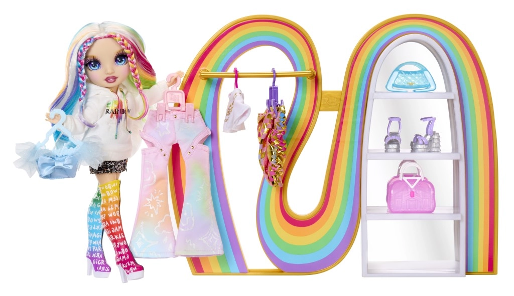 - 1 lėlė, vaivorykštinė spinta/stovas, 6 madingi drabužių vienetai, 2 poros batų, 2 rankinės, šepetys, drabužių stovas su 4 pakabomis, 4 pakopų batų lentynos
