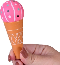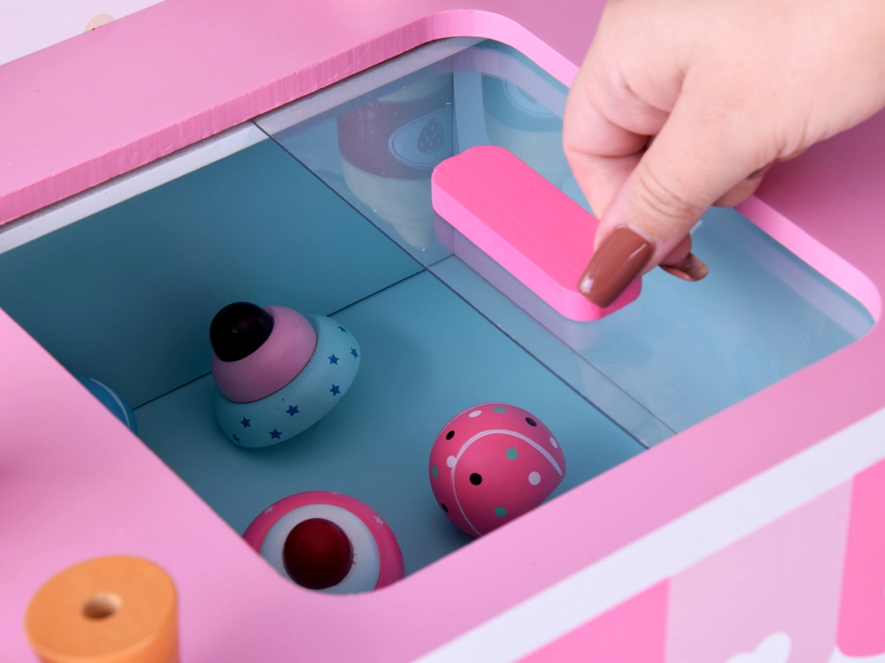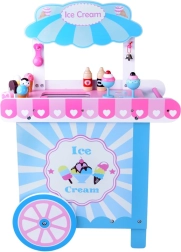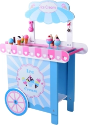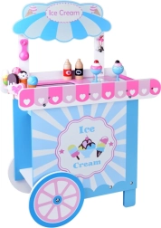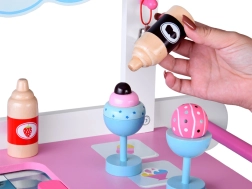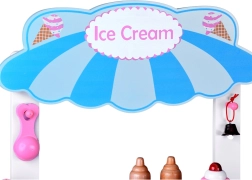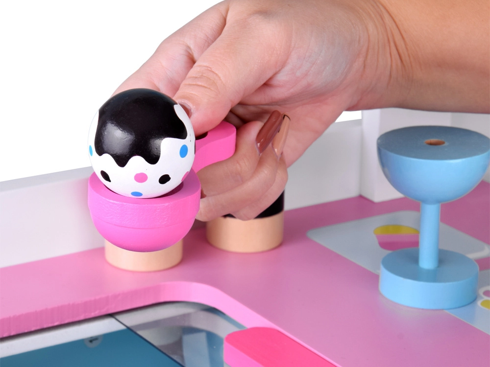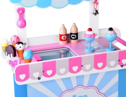 Šis stilingas vaikų ledų vežimėlis švelnių rožinių ir mėlynų atspalvių – idealus žaidimams „parduotuvę“ ar „ledinę“. Viršutinis pultas tarnauja kaip prekystalis kaušeliams, rageliams ir ledams ant pagaliuko eksponuoti, po juo rasite didelę lentyną ir slankiojamą „šaldytuvą“ skanėstams ir priedams laikyti. Praktiški du kabliukai ir sidabrinis varpelis kuria autentišką serviravimo patirtį.