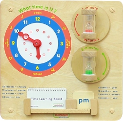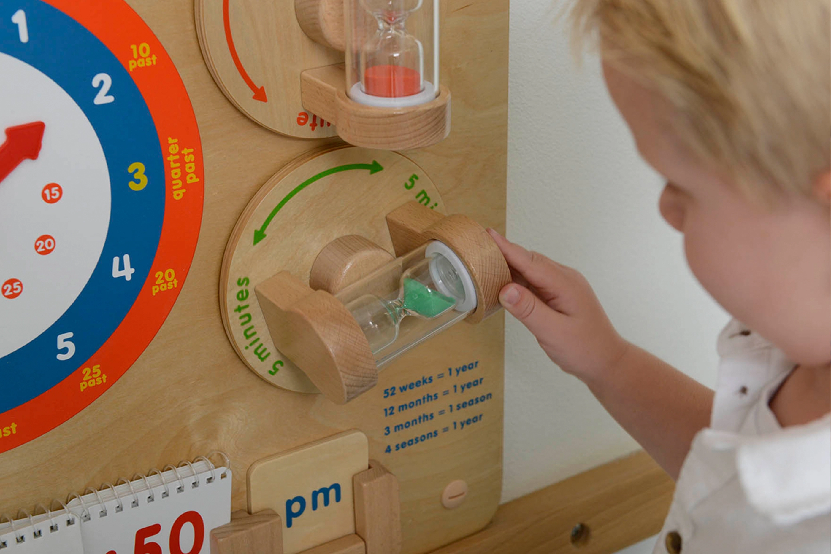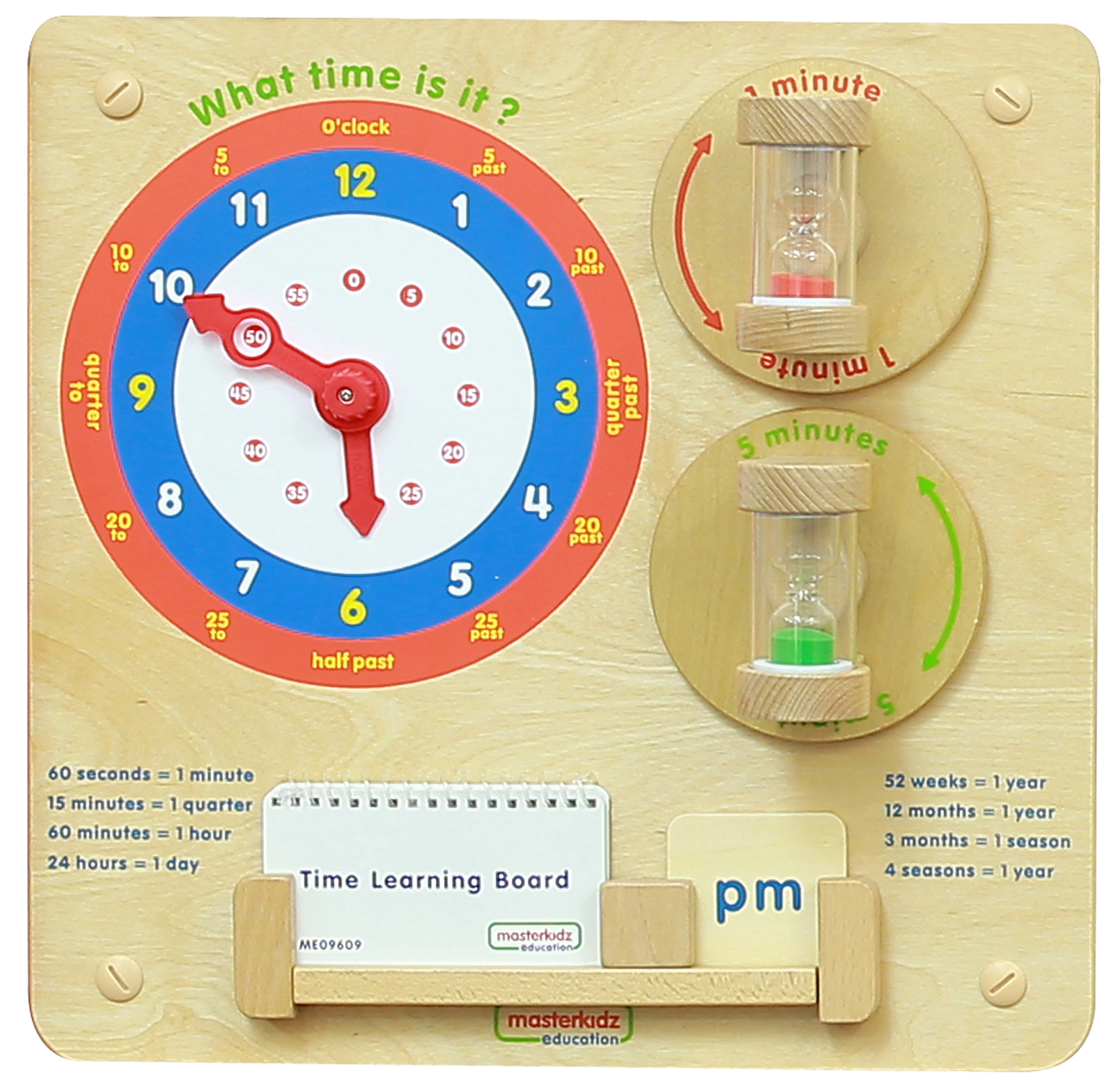 Medinė edukacinė lenta MASTERKIDZ moko vaikus skaityti laiką nuo klasikinių laikrodžių, suprasti minutes, valandas ir dienas bei suvokti laiko trukmę naudojant dvi smėlio kolbas (1 ir 5 minučių). Patvari konstrukcija tvirtinimui prie sienos arba Masterkidz Flex sistemos, judančios rodyklės ir aiškūs užrašai skatina loginį mąstymą, smulkiąją motoriką ir savarankišką žaidimą.