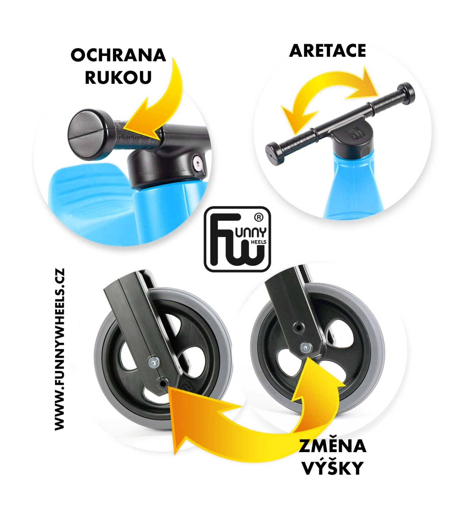 Ribotas šakės pasisukimo kampas neleidžia vairui persisukti, o išplatinti rankenų galai saugo vaiko rankas.