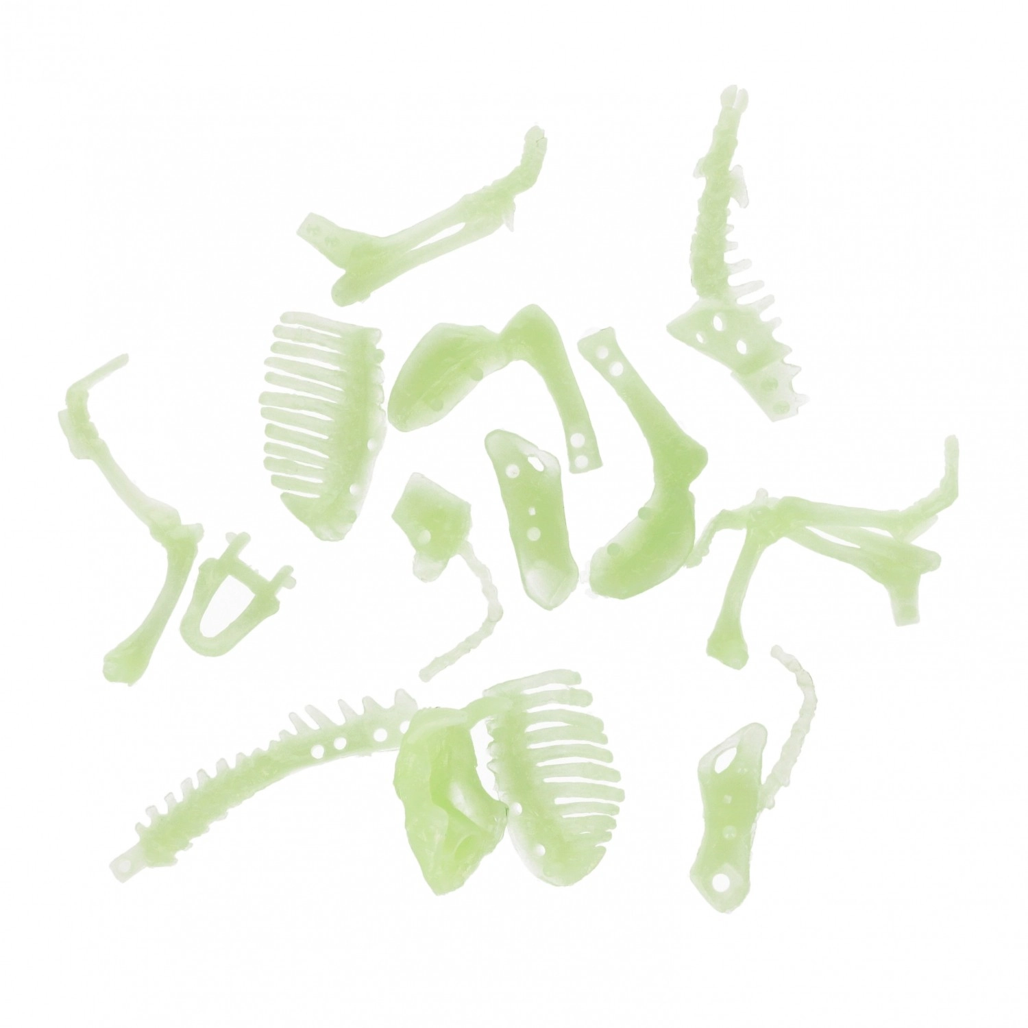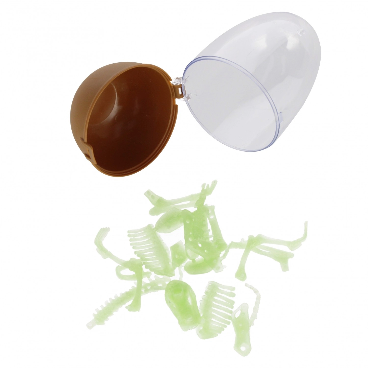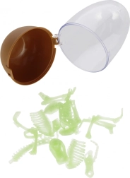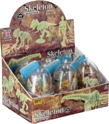Smulkūs kieto plastiko komponentai suformuoti į realistiškus kaulus – nuo kaukolės, per stuburą iki galūnių. Apšvietus skeletas įspūdingai švyti tamsoje, kas suteikia paslaptingą atmosferą ir skatina vaiko vaizduotę. Puiki dovana, kolekcijai ar išradinga vaikų kambario dekoracija.