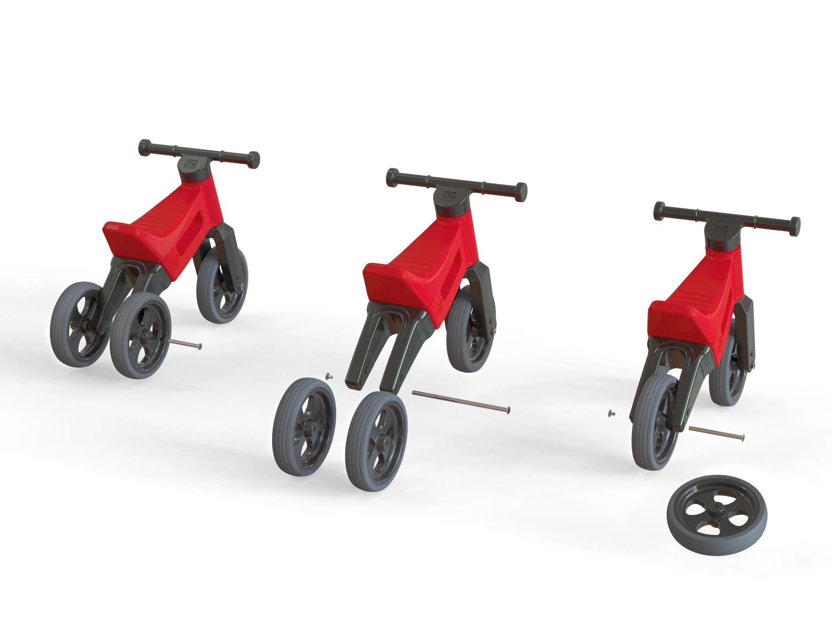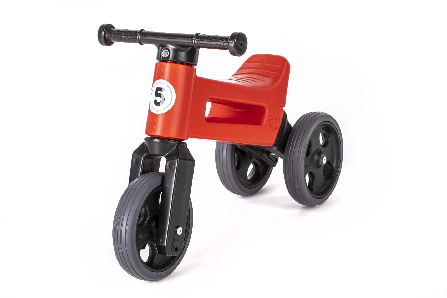 FUNNY WHEELS Rider Sport 2-in-1 – išmanus balansinis dviratukas, prisitaikantis prie jūsų vaiko augimo tempo. Pradėkite nuo stabilios triračio versijos dėl saugumo ir komforto, o atėjus laikui lengvai pereikite prie dviračio versijos pusiausvyrai treniruoti. Dėka reguliuojamos sėdynės (28/31 cm) ir tylių padangų mažieji vairuotojai mėgausis sklandžiu ir saugiu važiavimu namuose ir lauke.