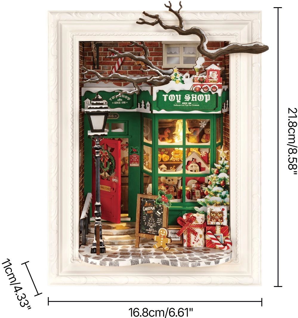 Ženkite į pasaulį, kuriame svajonės virsta tikrove. Miniatiūrinė Kalėdų Senelio žaislų parduotuvė iš Rolife išsiskiria realistinėmis detalėmis – nuo šviečiančios žibinto ir raudonų durų, per kalėdinę eglutę su sniego kepure, iki raudonų plytų sienų ir vitrinose išdėliotų dovanų. Dėl LED apšvietimo modelis įgauna unikalią atmosferą ir tampa išskirtine dekoracija.
