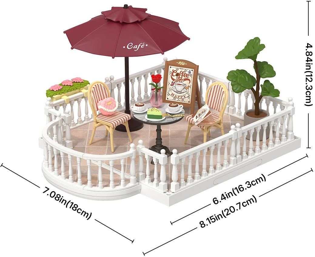 Išplėskite savo miniatiūrinį pasaulį stilinga Chic Café terasa ir susikurkite mielą kavinės kampelį arba saulėtą poilsio vietą. Rinkinys sukurtas lengvai jungti su Rolife Super Creator serijos kambariais ir suteikia autentiškų detalių – nuo staliuko su saldumynais iki skėčio ir gėlių.