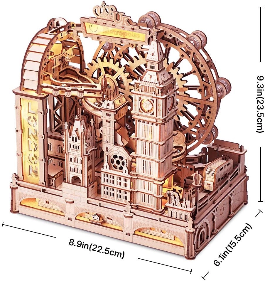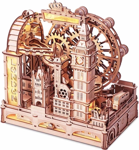 Atraskite ikoniškas Londono įžymybes elegantiškos 3D medinės dėlionės pavidalu. Modelis sujungia Big Beną, Tauerio tiltą ir London Eye su dinamiška rutuliukų trasa, kurioje metaliniai rutuliukai lekia rampos ir tuneliais pasitelkiant gravitaciją bei galingą variklį. Nepraleisti ir simboliniai Karūnos brangenybės – viskas su dėmesiu preciziškam apdirbimui.