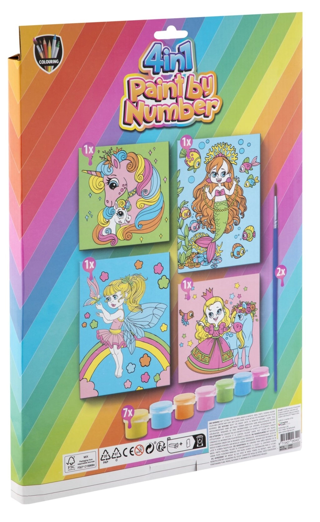 Atraskite linksmą kūrybinį rinkinį mažosioms tapyto-joms! Tapyba pagal skaičius 4 viename siūlo keturis žavius paveikslėlius su mergaitiškais motyvais, kuriuos vaikai lengvai nuspalvina pagal skaičius. Paprastas ir smagus kūrybinis užsiėmimas lavina kantrybę, sutelktumą ir smulkiąją motoriką. Viskas, ko reikia, yra pakuotėje.