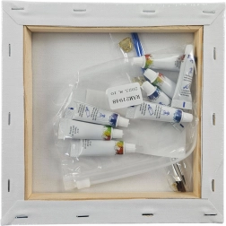 - Drobė ant rėmo, akriliniai dažai, teptukai, pakabinimo priedai (pagal rinkinį)