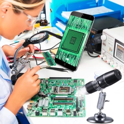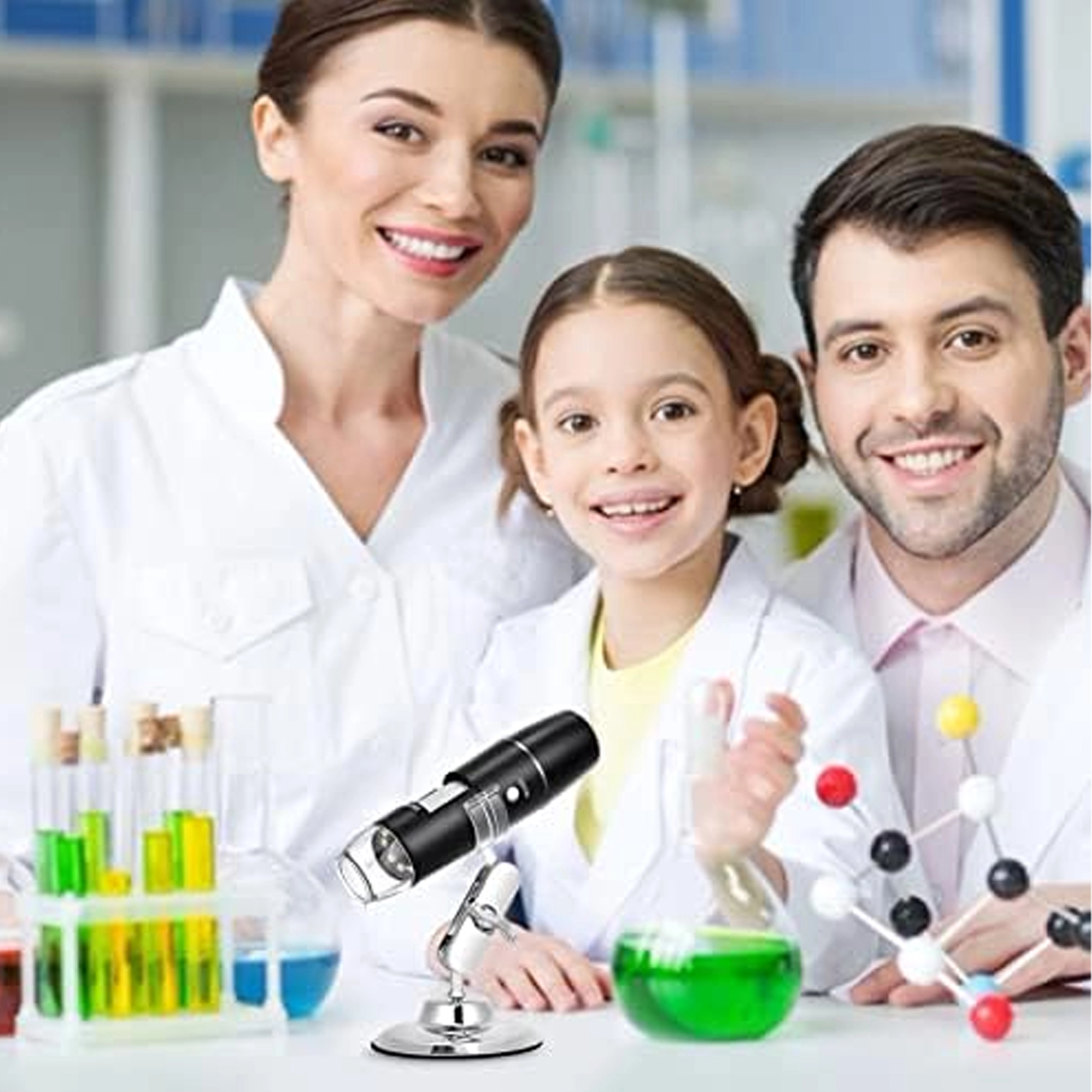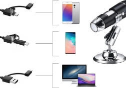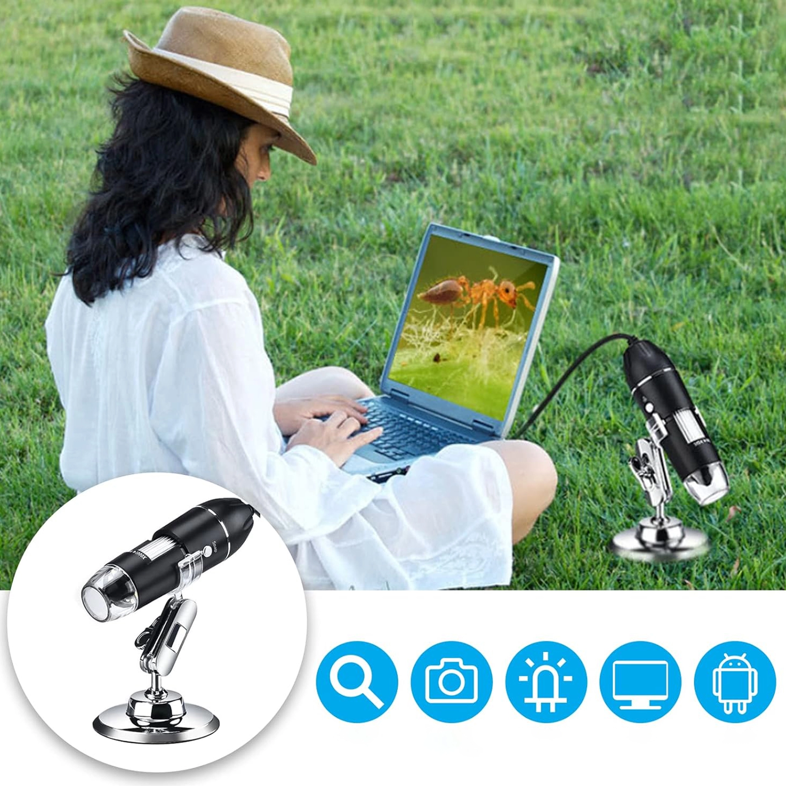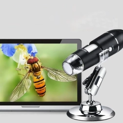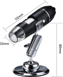 Valdymas intuityvus – tikslų fokusavimą atliekate pasukamu ratuku ant mikroskopo korpuso, o stovas suteikia stabilią bazę ryškioms nuotraukoms ir vaizdo įrašams. Per USB gaunate ir maitinimą, ir duomenų ryšį, tad greitai fiksuosite nuotraukas ir įrašus dokumentacijai ar mokymuisi.