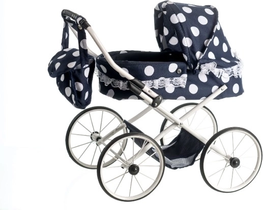 Stilingas retro dizaino lėlių vežimėlis pradžiugins kiekvieną mažąją mamytę. Siūlo juodą modelį su taškeliais ir elegantiškais nėriniais, reguliuojamą 55 cm rankeną patogiam stūmimui ir nulenkiamą stogelį lengvai priežiūrai. Komplekte yra rankinė ant rankenos ir praktinis apatinis krepšelis smulkmenoms.