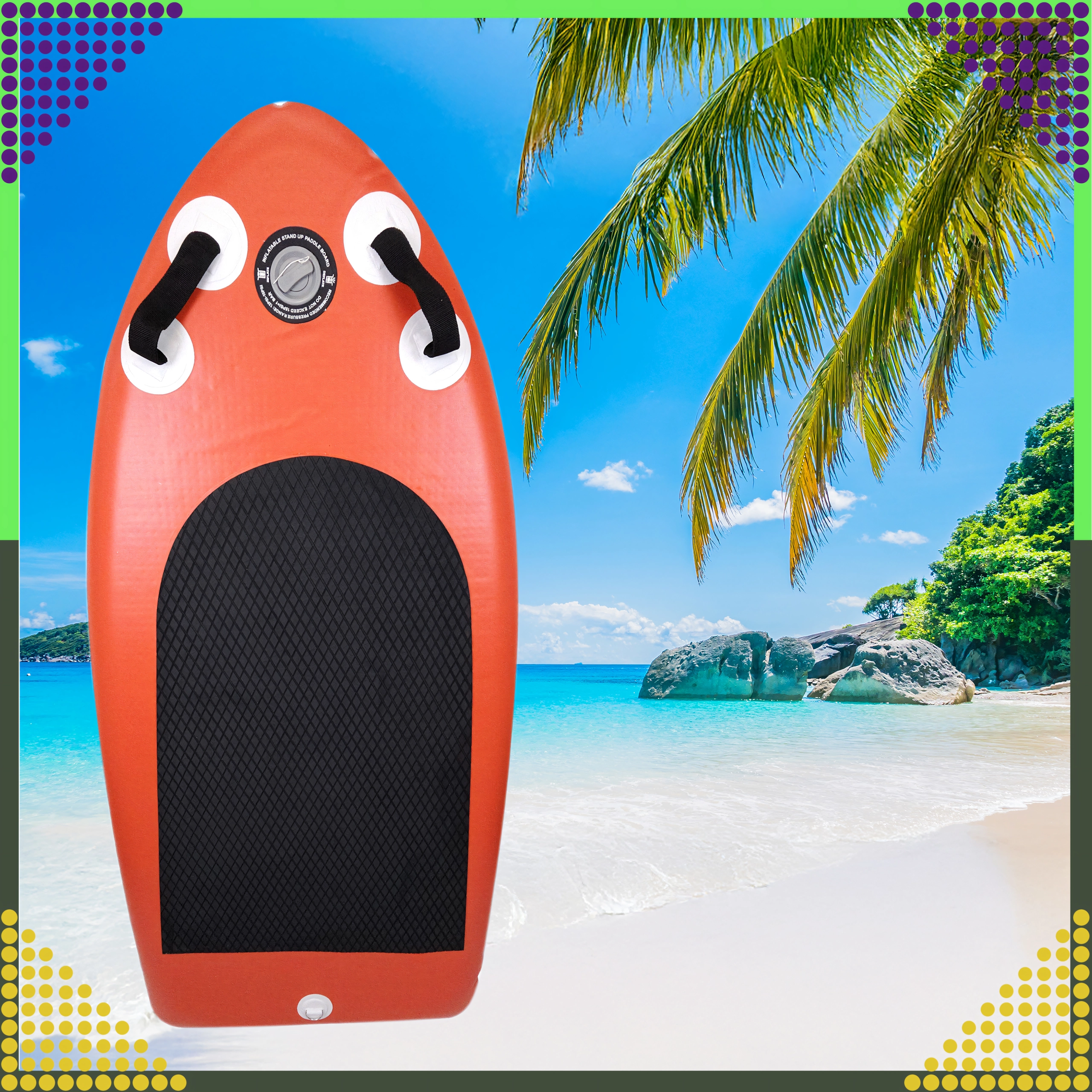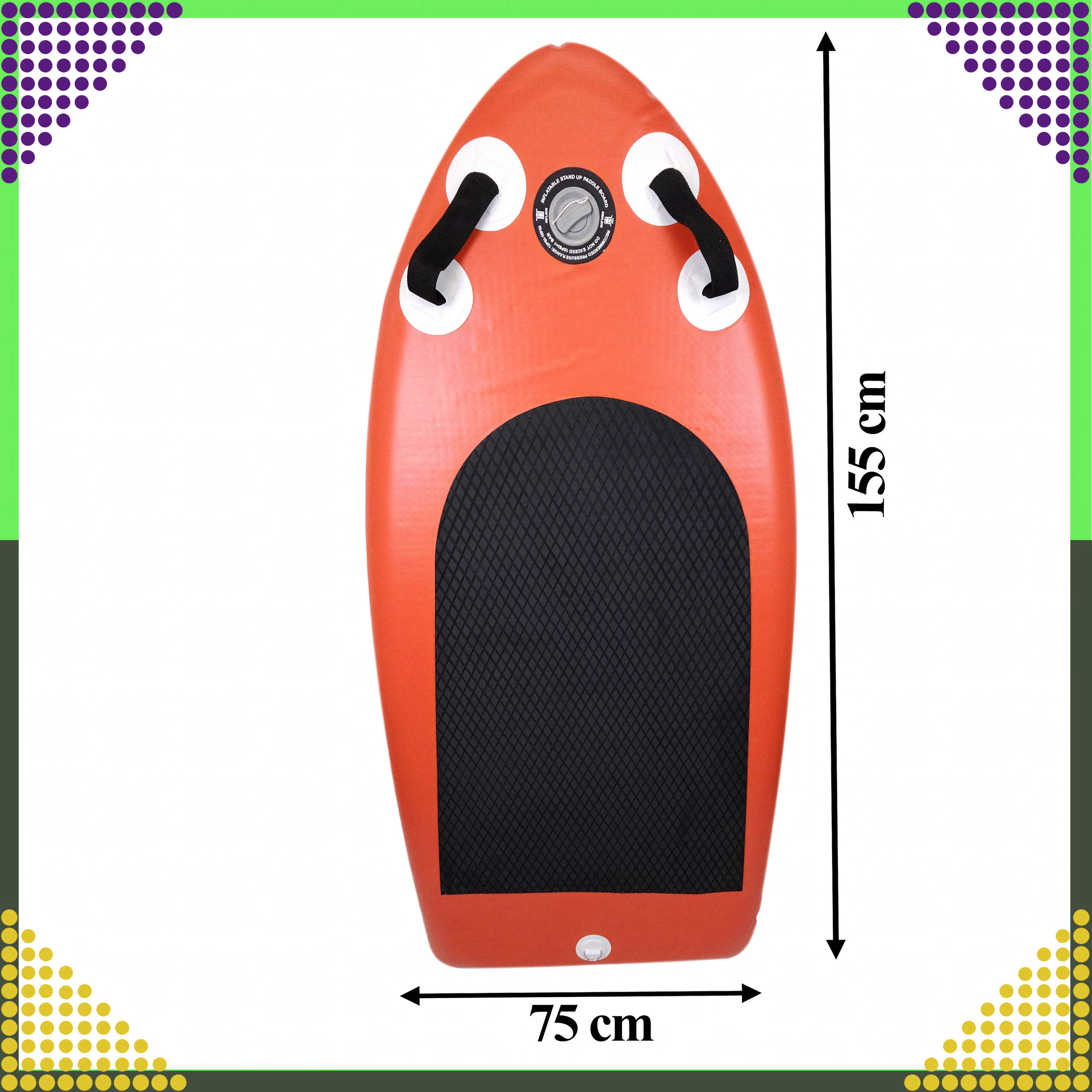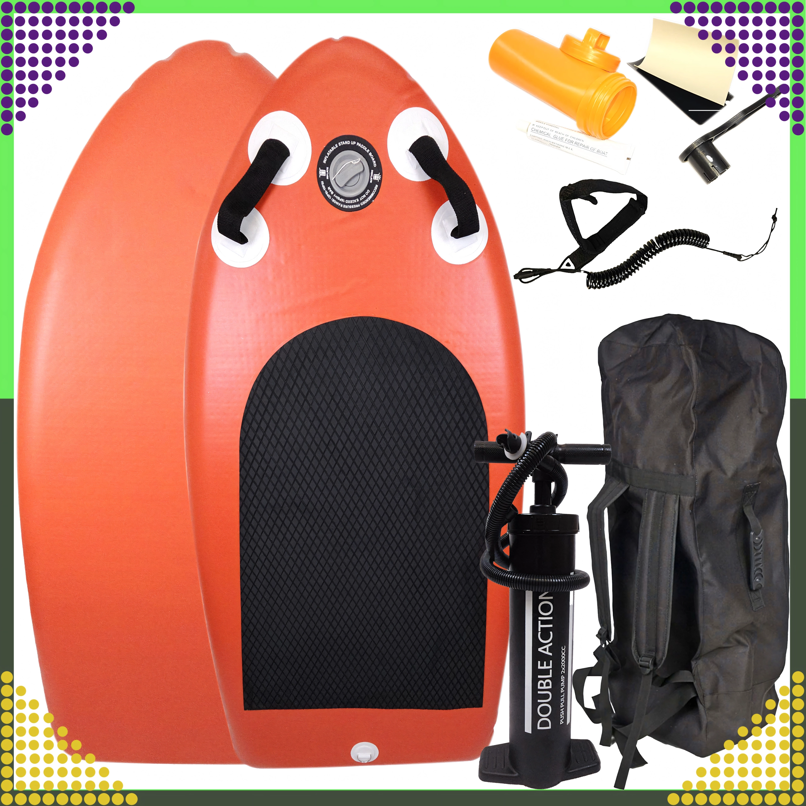 Kompaktiškas pripučiamas SUP vaikams ir suaugusiesiems sujungia stabilumą, mažą svorį ir greitą pripūtimą. Neslystanti EVA danga, priekinės rankenos ir kokybiški priedai, įskaitant rankinę dvigubo veikimo pompą, spiralinį pavadėlį ir transportinę kuprinę, užtikrina patogius įspūdžius ant vandens. Keliamoji galia iki 130 kg ir patvari konstrukcija iš sustiprinto PVC ilgam naudojimui.