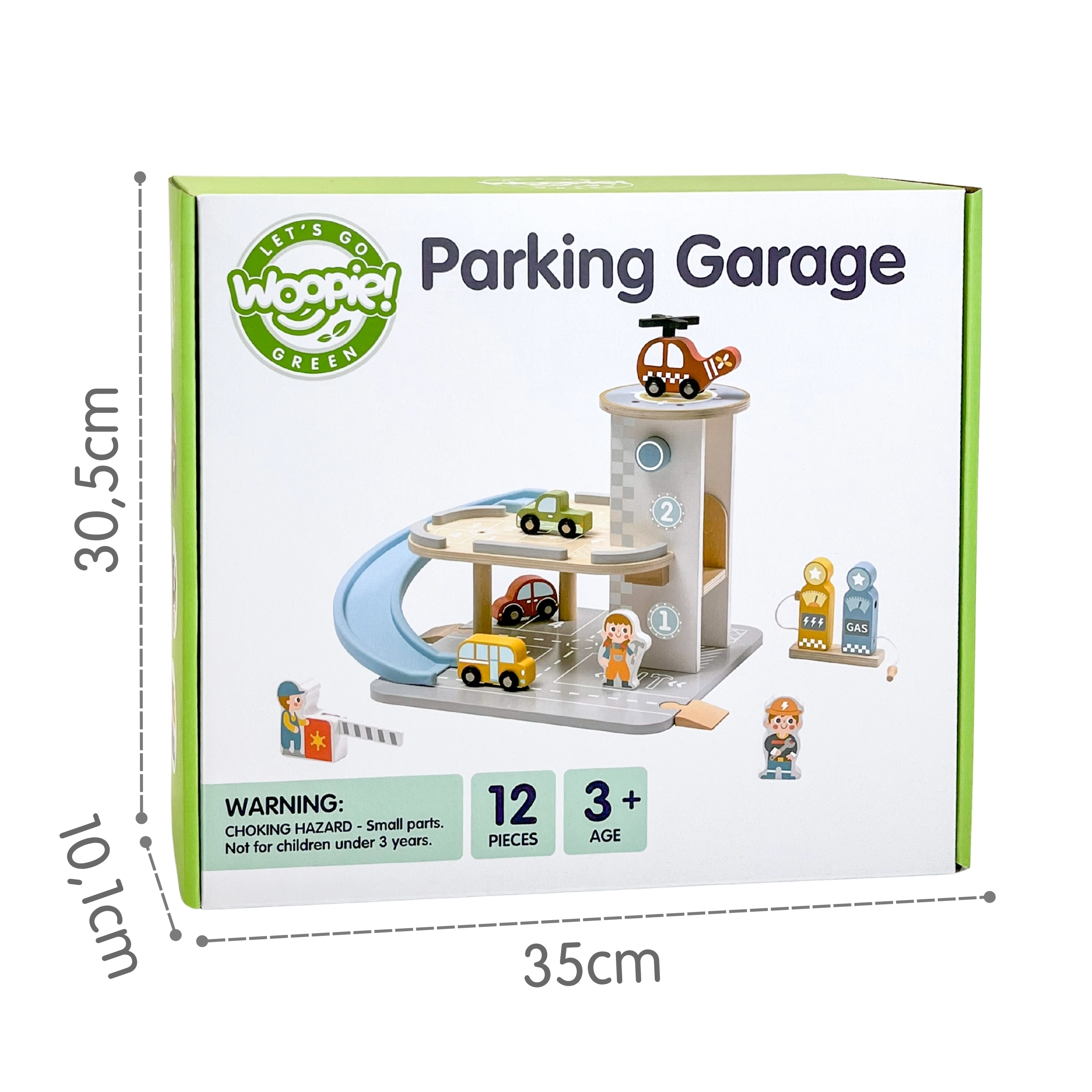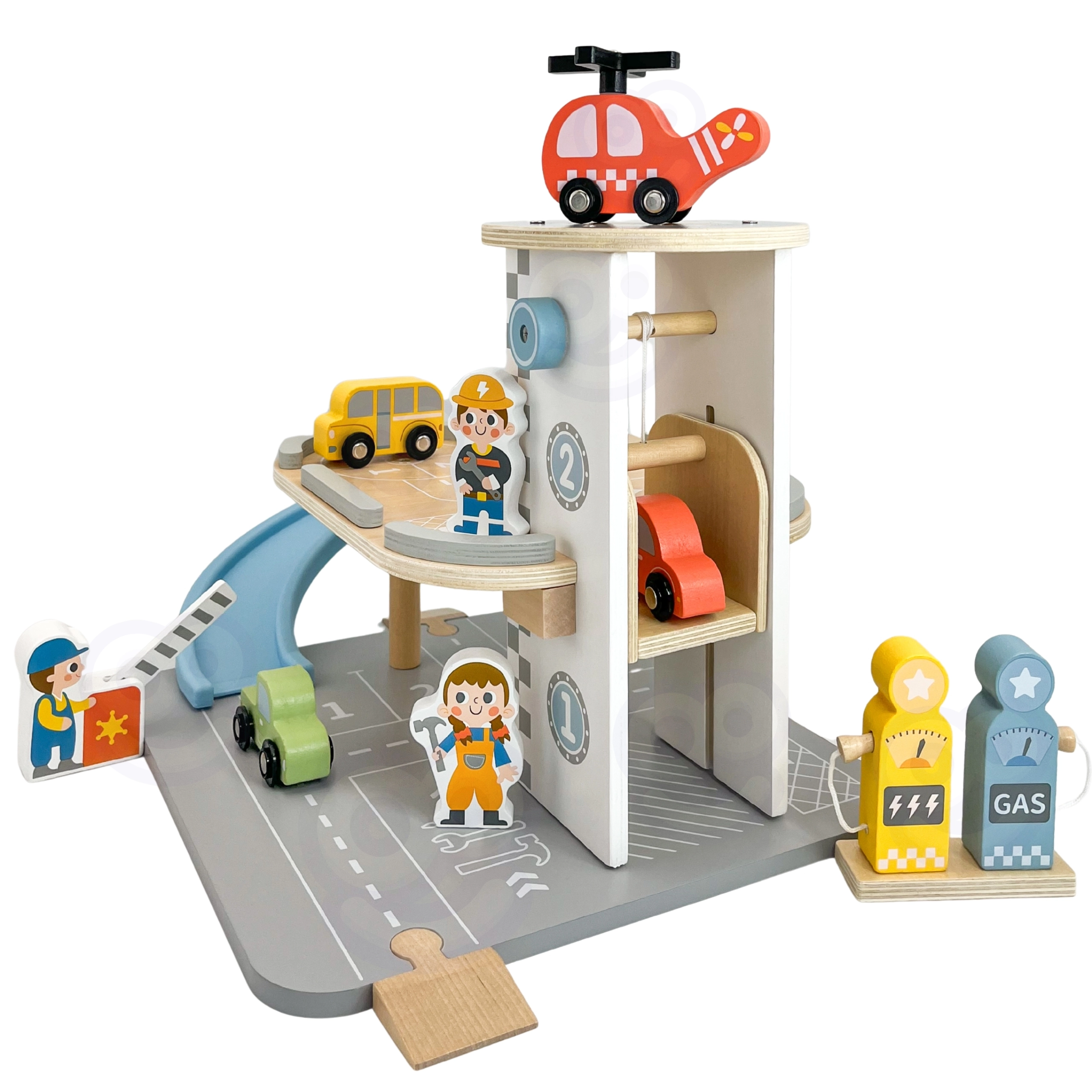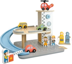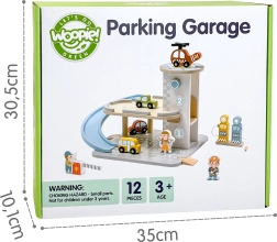 Medinis 2 iš 1 parkingas sujungia dviejų aukštų garažą ir degalinę, kad vaikai galėtų žaisti vairavimą, parkavimą ir pildyti kurą. Automobiliukai lekia mėlyna spiraline rampa, sraigtasparnis su besisukančiu sraigtu leidžiasi ant stogo heliporto, o aptarnavimo figūrėlės rūpinasi veikla. Kokybiškas medinis apdirbimas ir stabili bazė užtikrina saugų žaidimą nuo 3 metų.