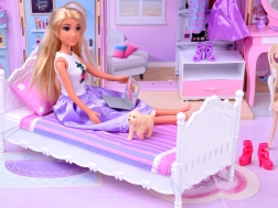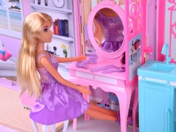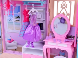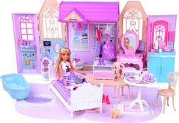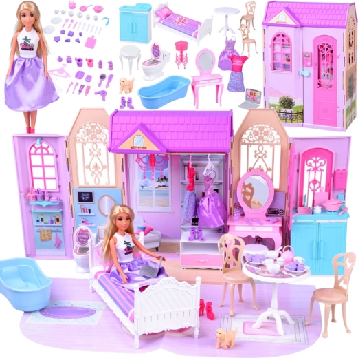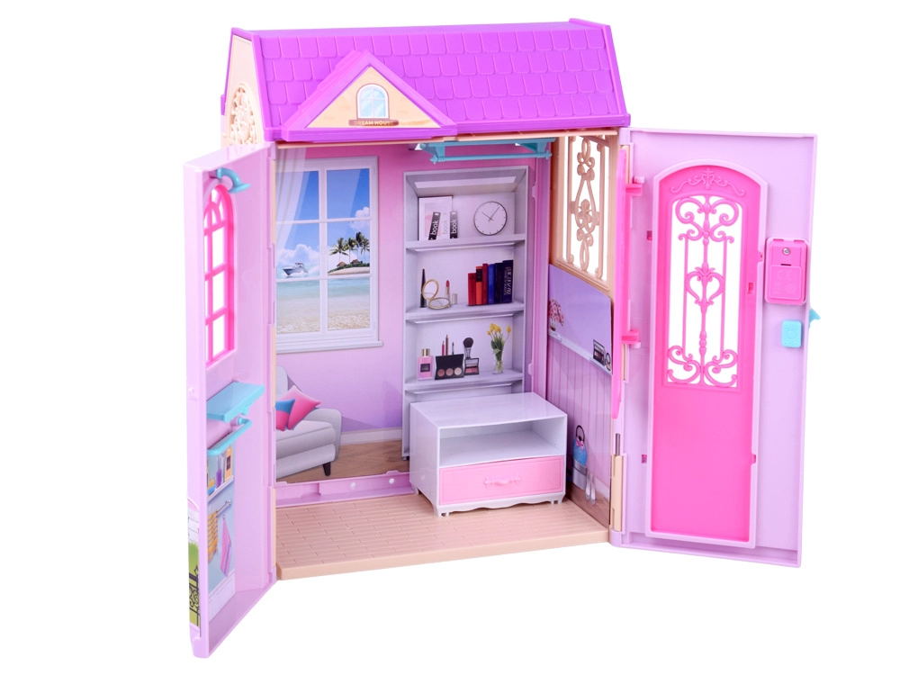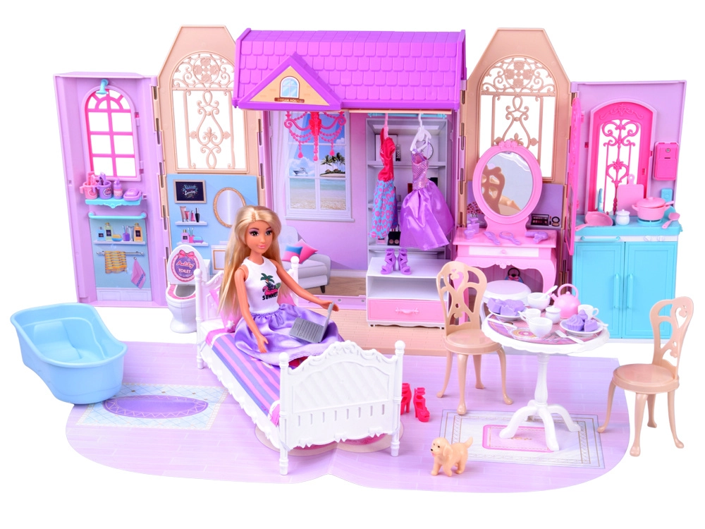 Sulankstomas rožinis–violetinis namelis sukurtas kaip praktiškas lagaminėlis, kurį vaikai lengvai pasiims į darželį, atostogas ar pas draugus. Išskleidus susiformuoja jaukūs mini namai su trimis pilnai įrengtomis zonomis: vonios kambariu ilgoms maudynėms, miegamuoju su toletiniu staliuku grožiui ir poilsiui bei virtuve – kiekvieno namelio širdimi.