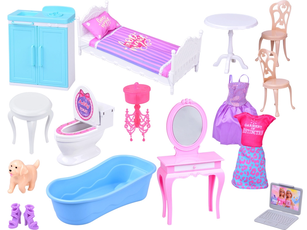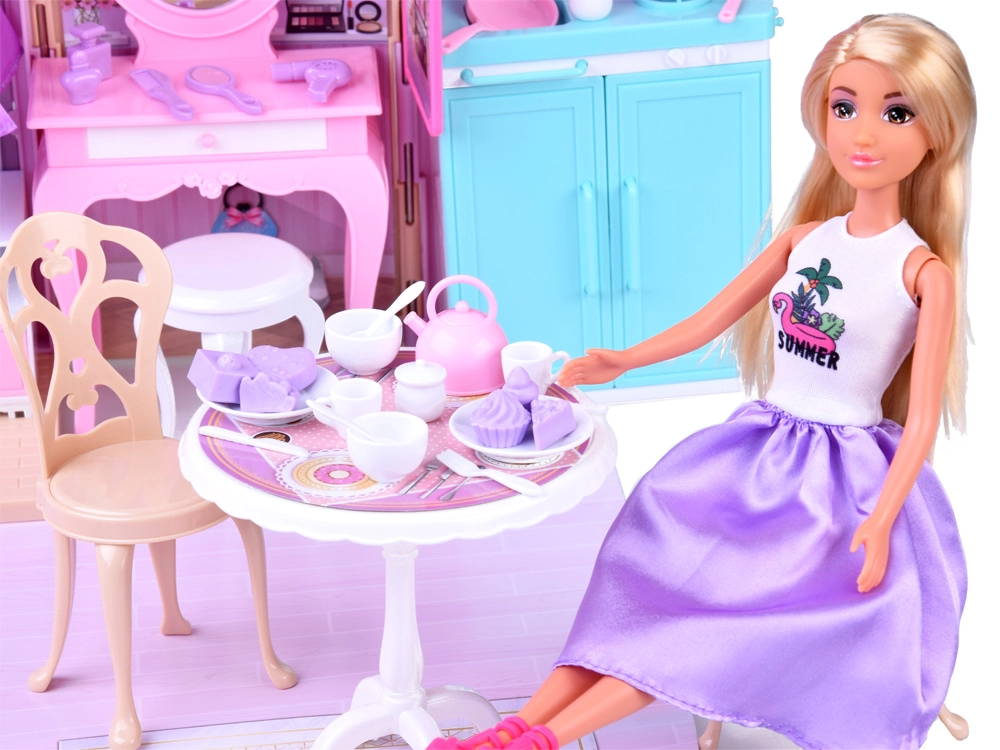 Vonios kambarys, miegamasis su toletiniu staliuku ir virtuvė sukuria pilnavertę lėlės namų aplinką. Atidaromos durys, langai ir detalios dekoracijos skatina vaizduotę bei realistišką žaidimą.