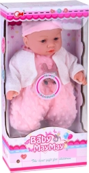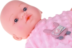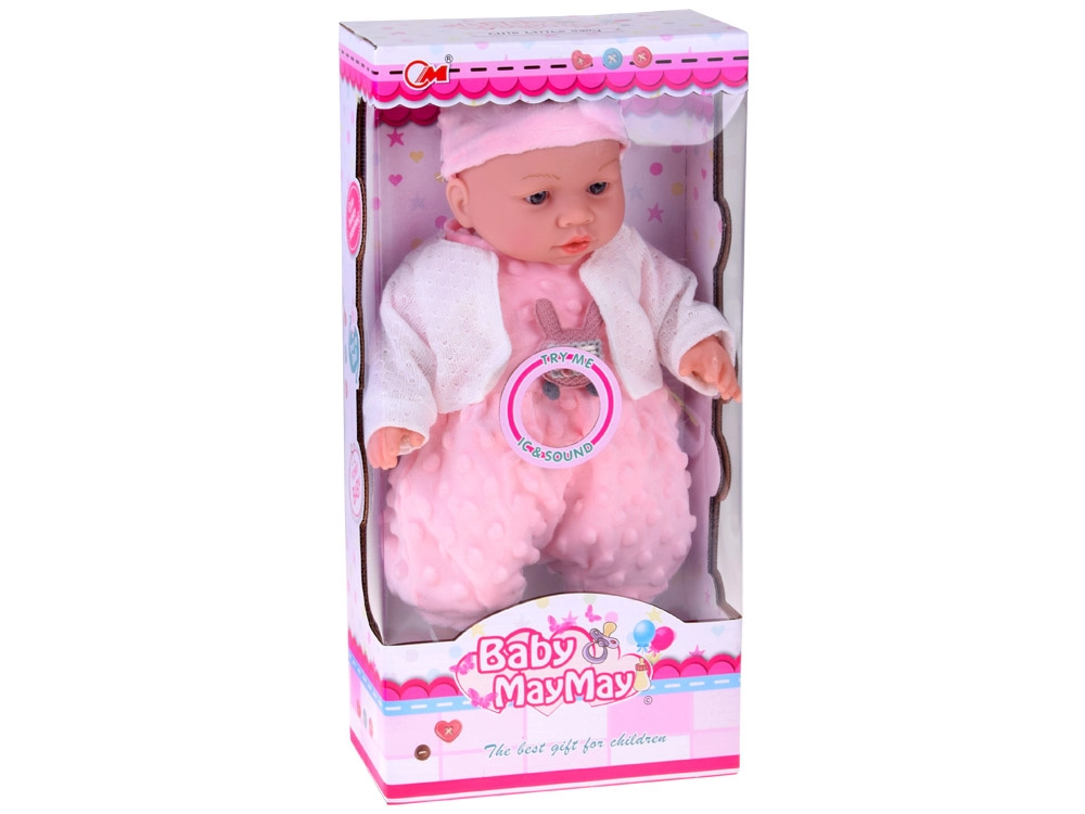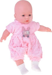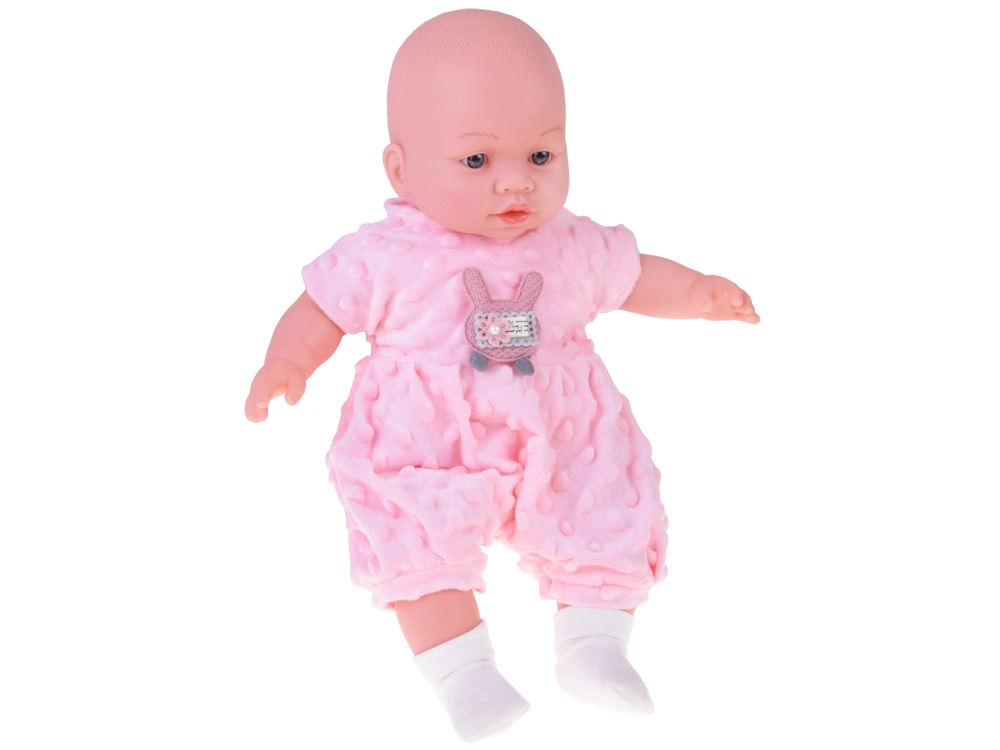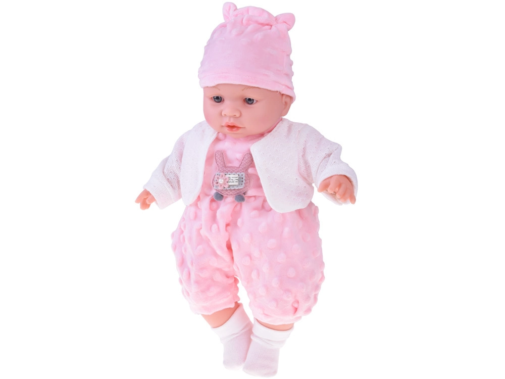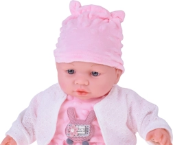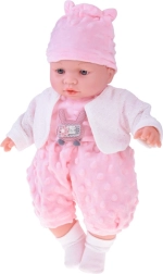 Mielas 40 cm ūgio kūdikėlis pradžiugins kiekvieną vaiką nuo 12 mėnesių. Dėl minkšto tekstilinio kūnelio puikiai tinka glėbiui, yra lengvas nešioti ir turi realistiškas veido detales. Paspaudus pilvuką skleidžia įvairius garsus – čiauška, juokiasi, paverkia ir murma. Rinkinyje yra švelnus rožinis minkštos minky medžiagos romperis su aplikacija, kepurėlė su ausytėmis, baltas kardiganas ir kojinaitės.