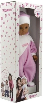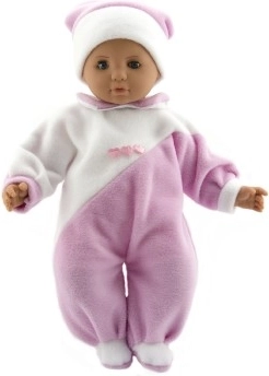 Mielas 50 cm ilgio kūdikis pradžiugins kiekvieną mažą mamytę. Jis turi minkštą audininį kūnelį, malonų glausti, ir yra aprengtas rožiniais–baltos spalvos kombinezonais. Puikiai tinka rūpinimosi žaidimams ir lavina vaiko vaizduotę bei smulkiąją motoriką.